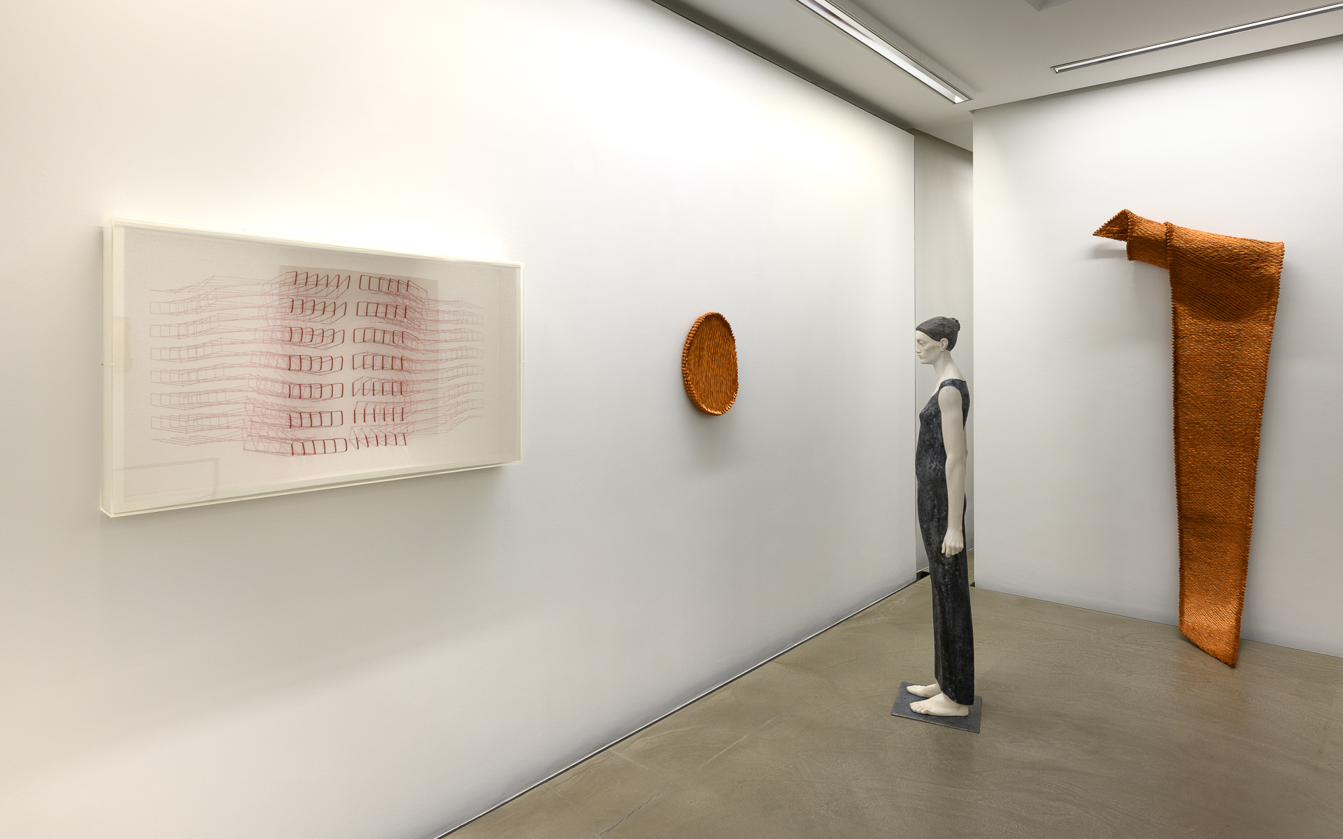 Le opere di ANTONELLA ZAZZERA sono invece il risultato di tessiture di filo di rame brunito che si trasforma in infiniti attimi luminosi per disegnare lo spazio con armonia.
