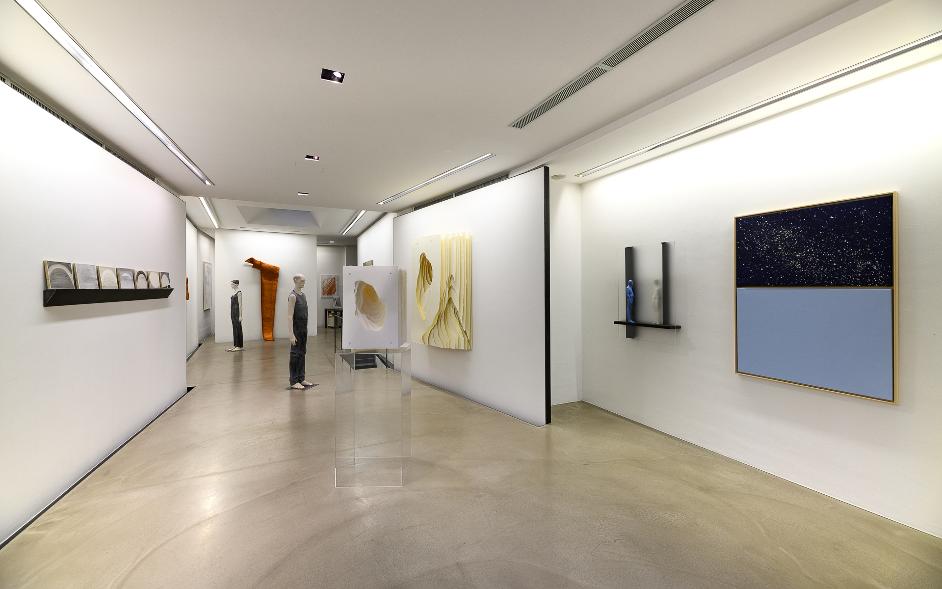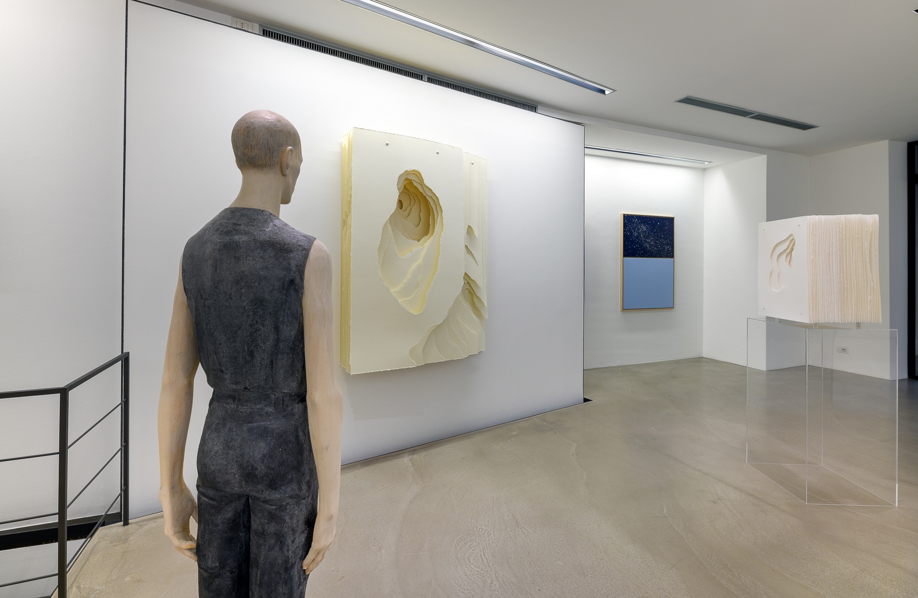 Le figure di HERMANN J. RUNGGALDIER, scolpite nel legno a grandezza naturale, si alternano nell’esposizione a figure di piccola dimensione, sospese invece su un ideale palcoscenico della vita, una architettura in plexiglas. Lo spazio, meticolosamente studiato, che ora divide o avvicina le figure definisce l'intensità delle relazioni.