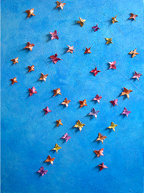 I piccoli animali sono collocati sulla tela a comporre un disegno geometrico o in aggregazioni casuali: sebbene il modus operandi dell’artista derivi da una chiara visione mentale dell’opera, la flagranza del processo creativo favorisce variazioni compositive. In Hungry Angry otto uccellini sono collocati nella parte inferiore dell’opera e le loro ali proiettano ombre sulla bianca tela conferendole un’eleganza minimale. La profonda sensibilità grafica dell’artista nasce con la pratica della scrittura tradizionale giapponese, lo shodō: un’arte che richiede grande abilità tecnica, poiché i rapporti proporzionali tra le linee seguono rigide regole di composizione, e che permette di elevarsi spiritualmente, infatti “Quando la mente è corretta, il pennello è corretto”.