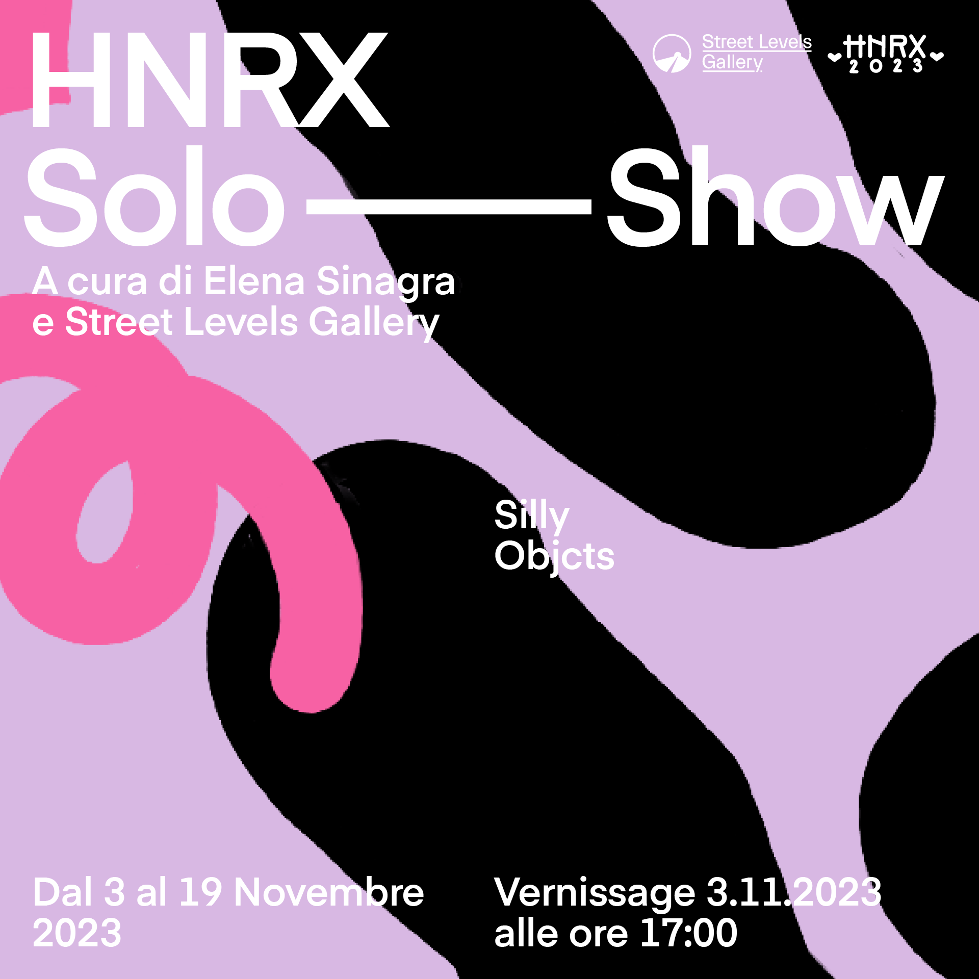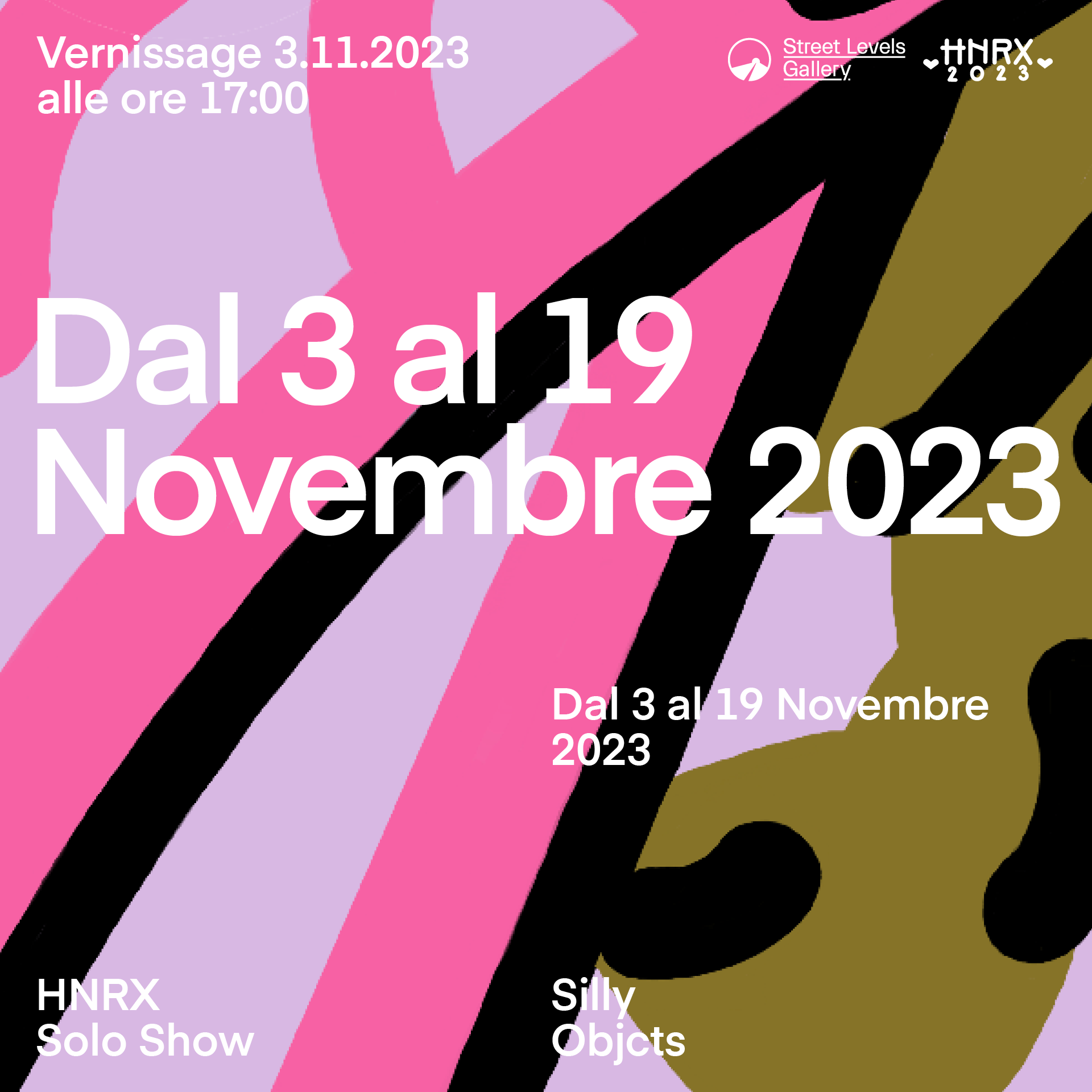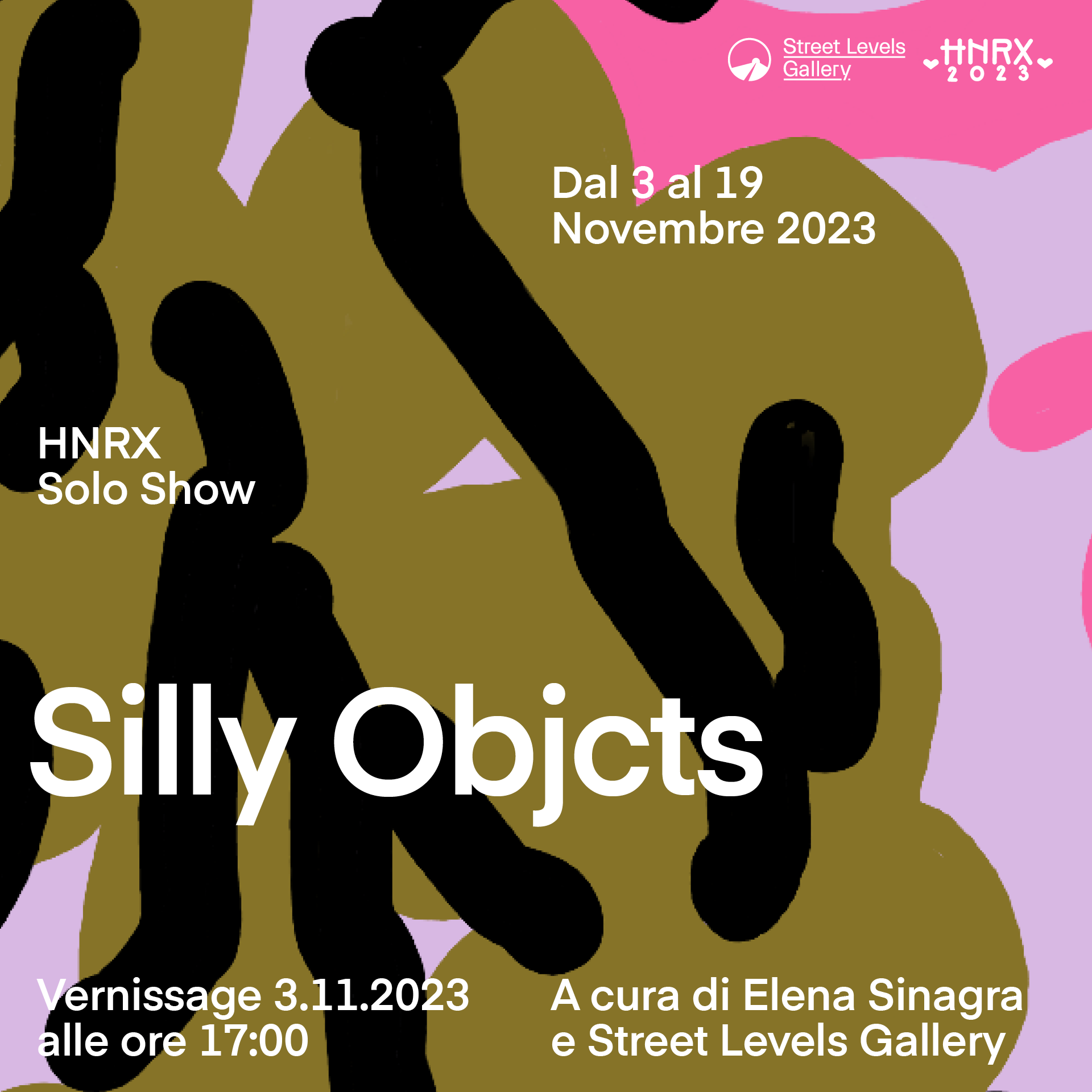 𝗦𝗶𝗹𝗹𝘆 𝗢𝗯𝗷𝗲𝗰𝘁𝘀 è la mostra di Street Levels Gallery che presenta gli ultimi lavori di HNRX, evidenziando la sua evoluzione stilistica verso l’astrazione e la configurazione. Il suo lavoro tocca la strada e lo studio, combinando scelte stilistiche che uniscono queste due polarità.