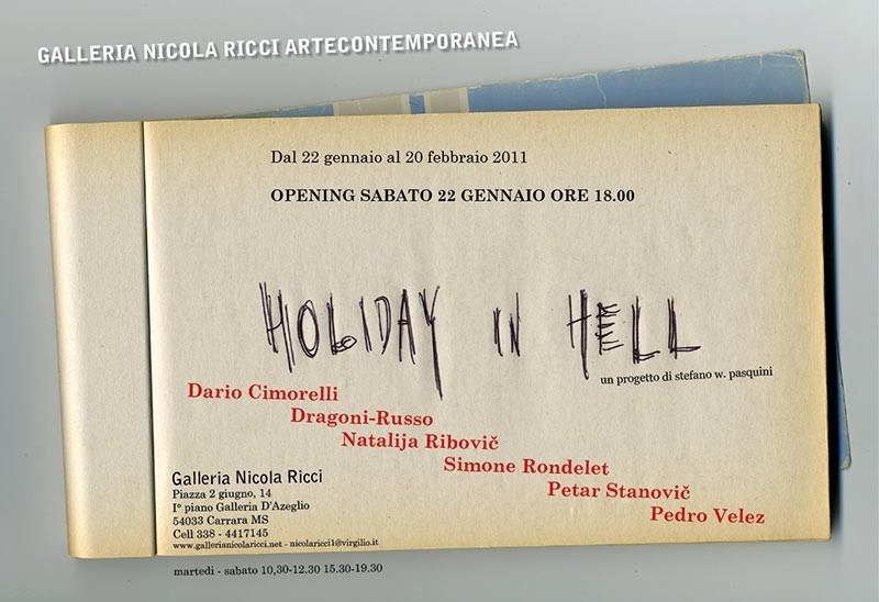 Holiday in Hell è la vacanza che si trasforma in inferno, ma può anche essere, potenzialmente, una vita d'inferno che si trasforma in vacanza. Questa mostra racconta i lievi disagi che la nostra società ci propone visti con gli occhi di sei artisti internazionali. L’elemento che li accomuna è la loro scultoreità, intendendo qui per scultura quella che, tra le belle arti, si colloca maggiormente all’interno della comunità, sia a livello filosofico che fisico. Questi artisti sono scultori in quanto il loro fare è nel mondo, non un mero sguardo dal di fuori. Mentre la francese Simone Rondelet spiazza lo spettatore con racconti inediti di discrepanze storiche, in una sorta di proto-wikileaks ironica e sboccata, il portoricano Pedro Velez,con le sua installazioni punk denuncia la corruzione della sua isola e la condizione femminile nella televisione latinamericana. La coppia Dragoni-Russo colleziona frammenti di routine famigliare per rivelare le contraddizioni del nostro fare personale, e Natalija Ribovič da Tokyo ci ricorda che le possibilità di costruzione un mondo personale e perfetto sono tuttora alla nostra portata. Dario Cimorelli raccoglie la sfida e sfoggia la sua visione del mondo in piccoli dettagli fotografici che ci ricordano che “l'eccezionale è qui”, mentre Petar Stanovič ci travolge con flashback cinematografici per mettere in discussione la temporalità delle cose.