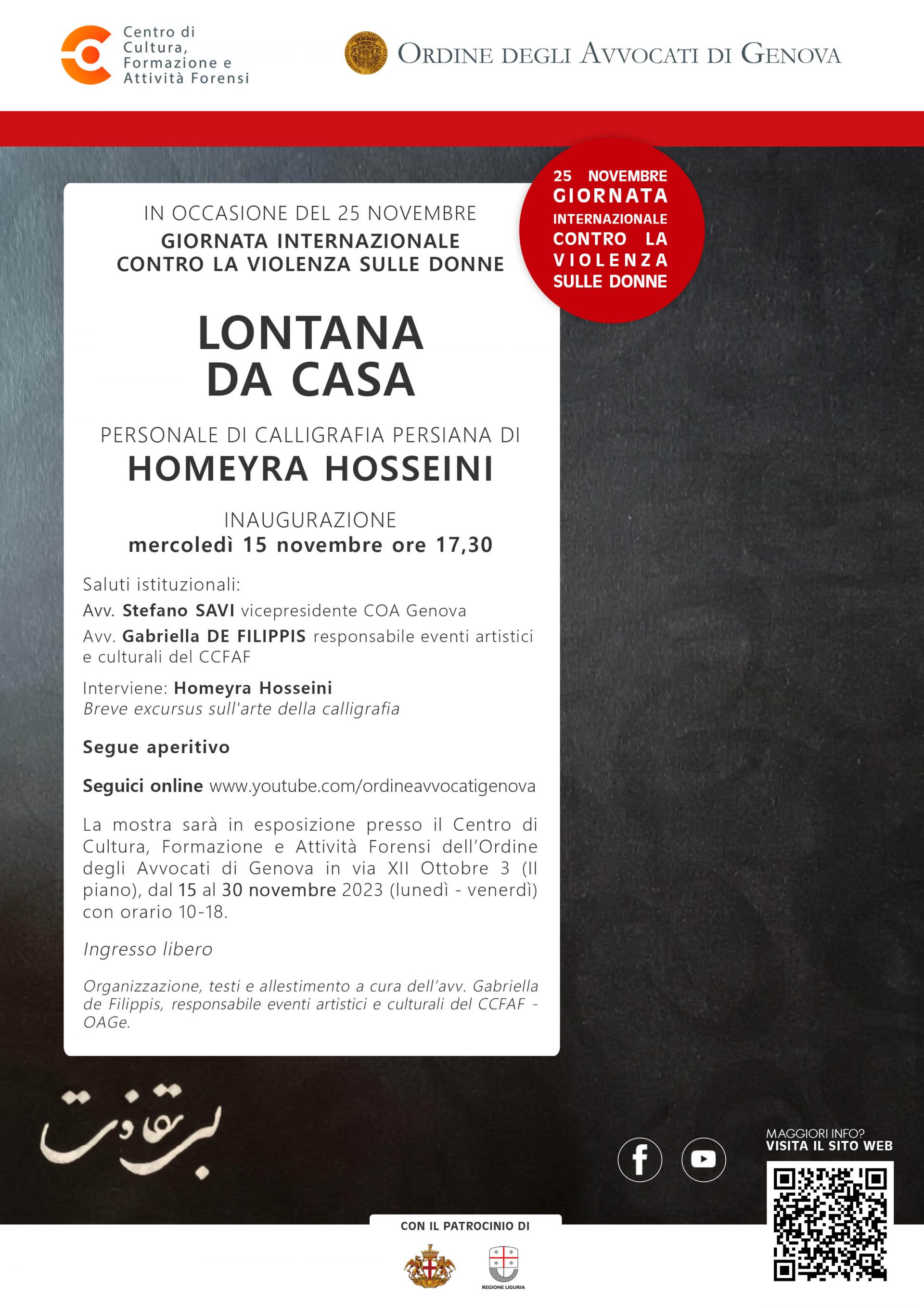 Alla inaugurazione sarà presente l’avv. Stefano Savi, vicepresidente dell’Ordine degli Avvocati di Genova, e l’artista Homeyra Hosseini, insieme all’avv. Gabriella de Filippis, organizzatrice della mostra, terrà una breve relazione sulla arte della calligrafia e sulla poesia persiana.