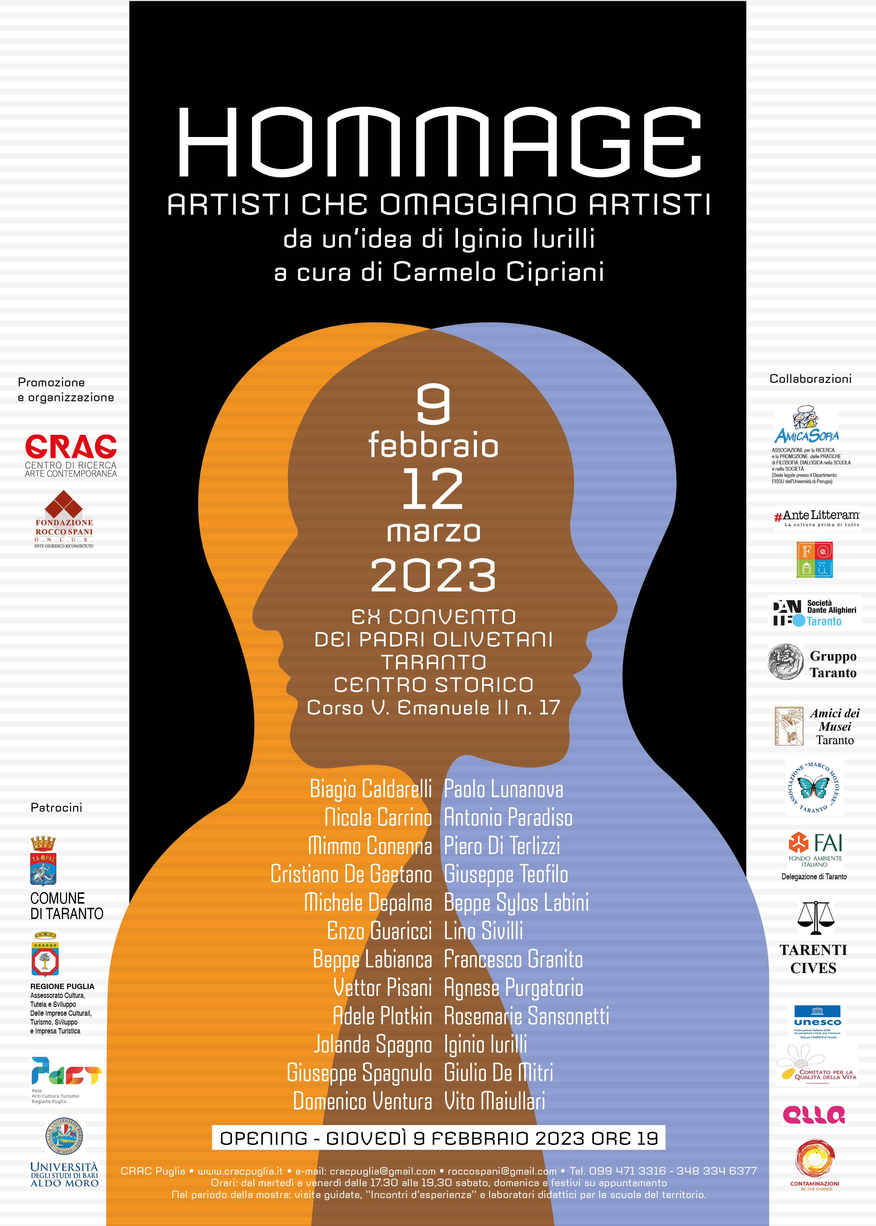 Giovedì 9 febbraio, alle ore 18, negli spazi del CRAC Puglia di Taranto (ex convento dei Padri Olivetani XIII sec.), in corso Vittorio Emanuele II, in pieno centro storico, si inaugurerà la mostra “Hommage. Artisti che omaggiano artisti”, a cura di Carmelo Cipriani, da un’idea di Iginio Iurilli.