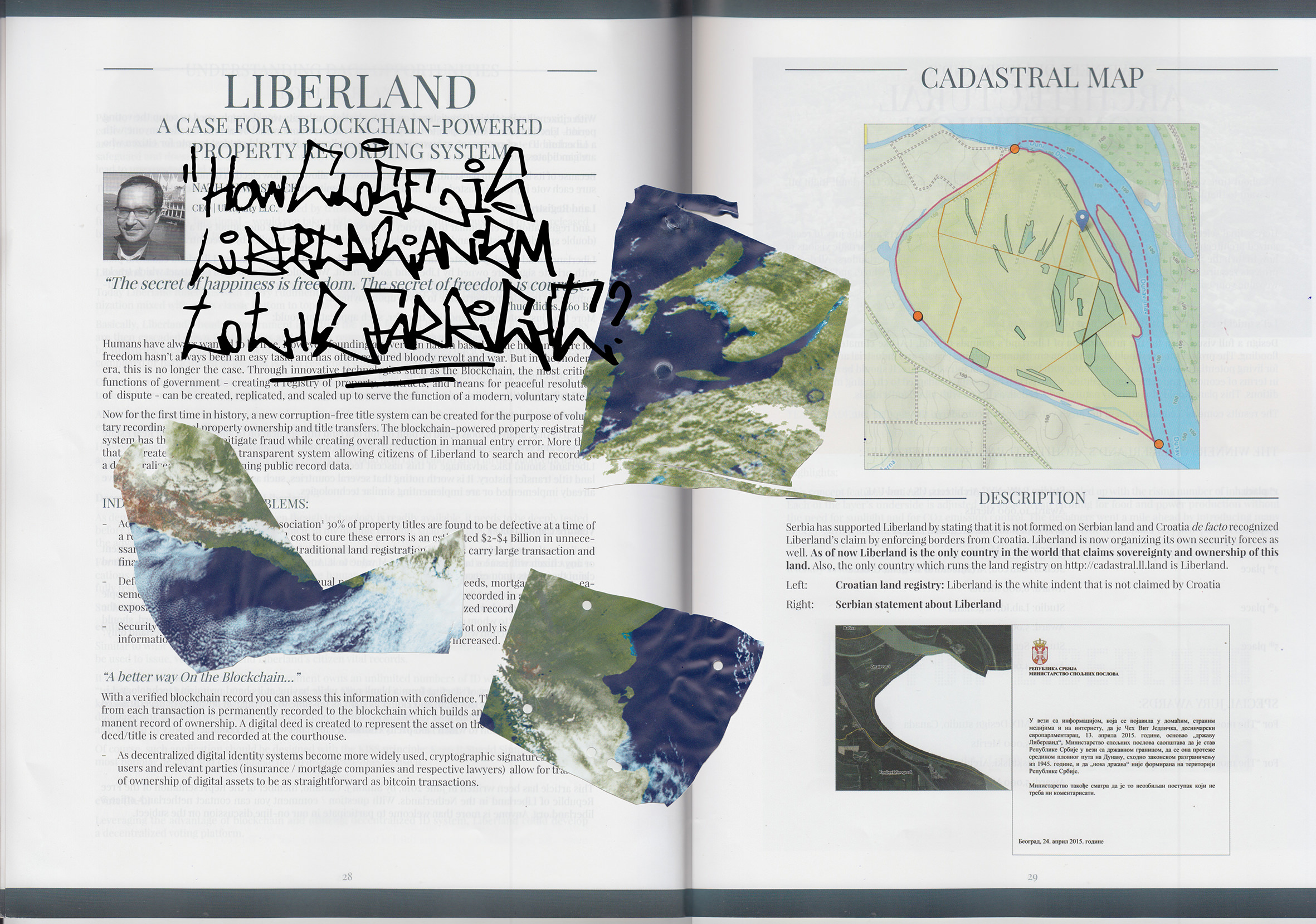 La nuova scultura di Simon Denny rappresenta la mappa della Libera Repubblica di Liberland, una nazione libertaria autoproclamata che si trova presumibilmente in una zona di sette chilometri in fase di negoziazione tra Croazia e Serbia. Nel tentativo di adottare una veste pubblica ufficiale Liberland ha già una propria moneta, francobolli, una bandiera e lo stemma. Per dimostrare l’esistenza di attività sociali nella neonata nazione, l’artista pone una seconda mappa sull’originale: essa raffigura il progetto architettonico vincitore di un recente bando per la colonizzazione di Liberland. La scultura di Denny sembra porre domande sempre più urgenti in Europa e oltre. Quanto vicino è il libertarianismo alla rinascita dell’estrema destra? Quali sono le implicazioni derivanti dall’ignorare l’odierna geopolitica nella ricerca di strutture finanziarie? Quale territorio –in senso letterale e figurato- i Techno-libertariani e la quota di estrema destra condivideranno nel prossimo futuro?