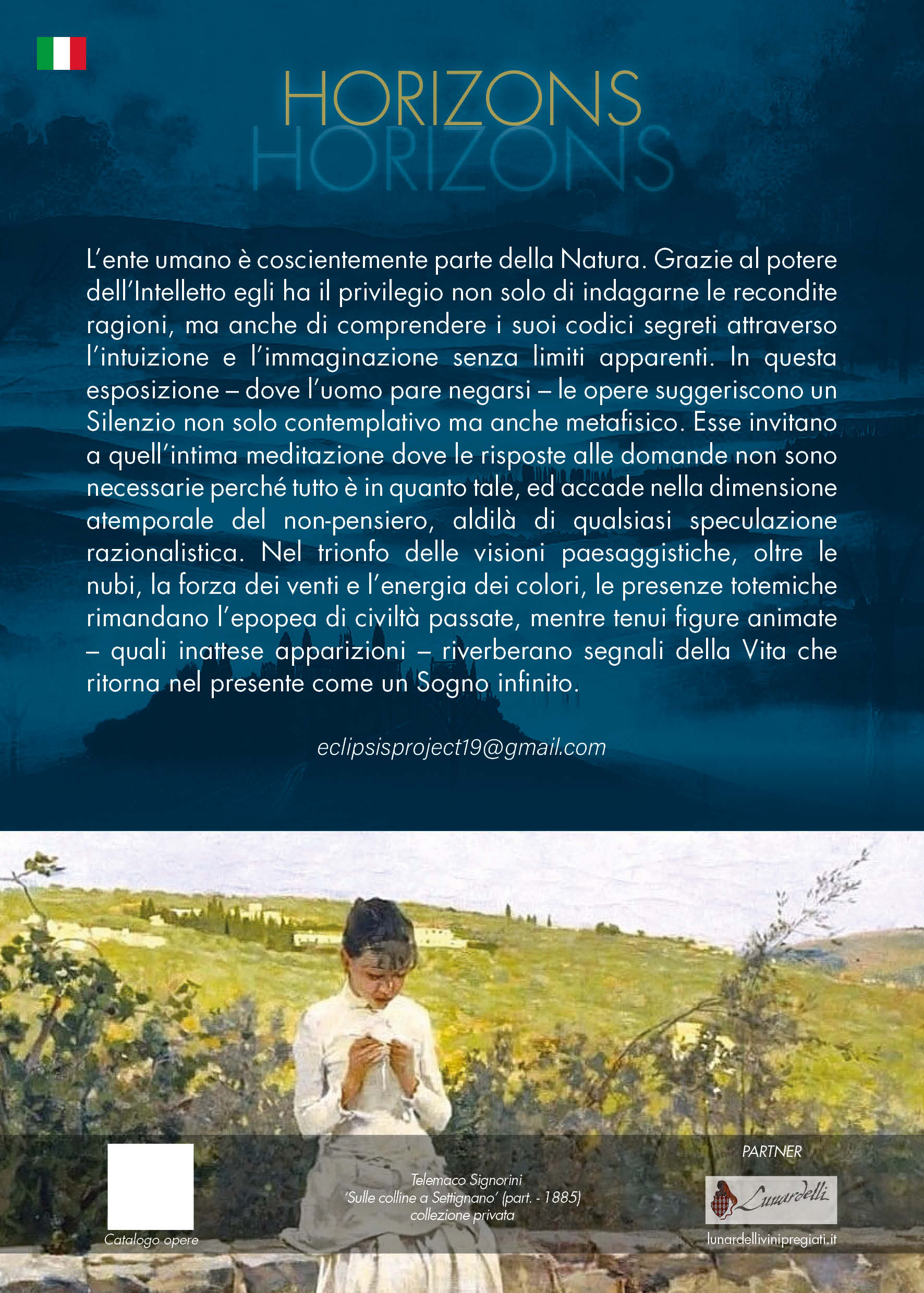 L'ente umano è coscientemente parte della Natura. Grazie al potere dell'Intelletto egli ha il privilegio non solo di indagarne le recondite ragioni, ma anche di comprendere i suoi codici segreti attraverso l'intuizione e l'immaginazione senza limiti apparenti. In questa esposizione – dove l'uomo pare negarsi – le opere suggeriscono un Silenzio non solo contemplativo ma anche metafisico. Esse invitano a quell'intima meditazione dove le risposte alle domande non sono necessarie perché tutto è in quanto tale, ed accade nella dimensione atemporale del non-pensiero, aldilà di qualsiasi speculazione razionalistica. Nel trionfo delle visioni paesaggistiche, oltre le nubi, la forza dei venti e l'energia dei colori, le presenze totemiche rimandano l'epopea di civiltà passate, mentre tenui figure animate – quali inattese apparizioni – riverberano segnali della Vita che ritorna nel presente come un Sogno infinito.