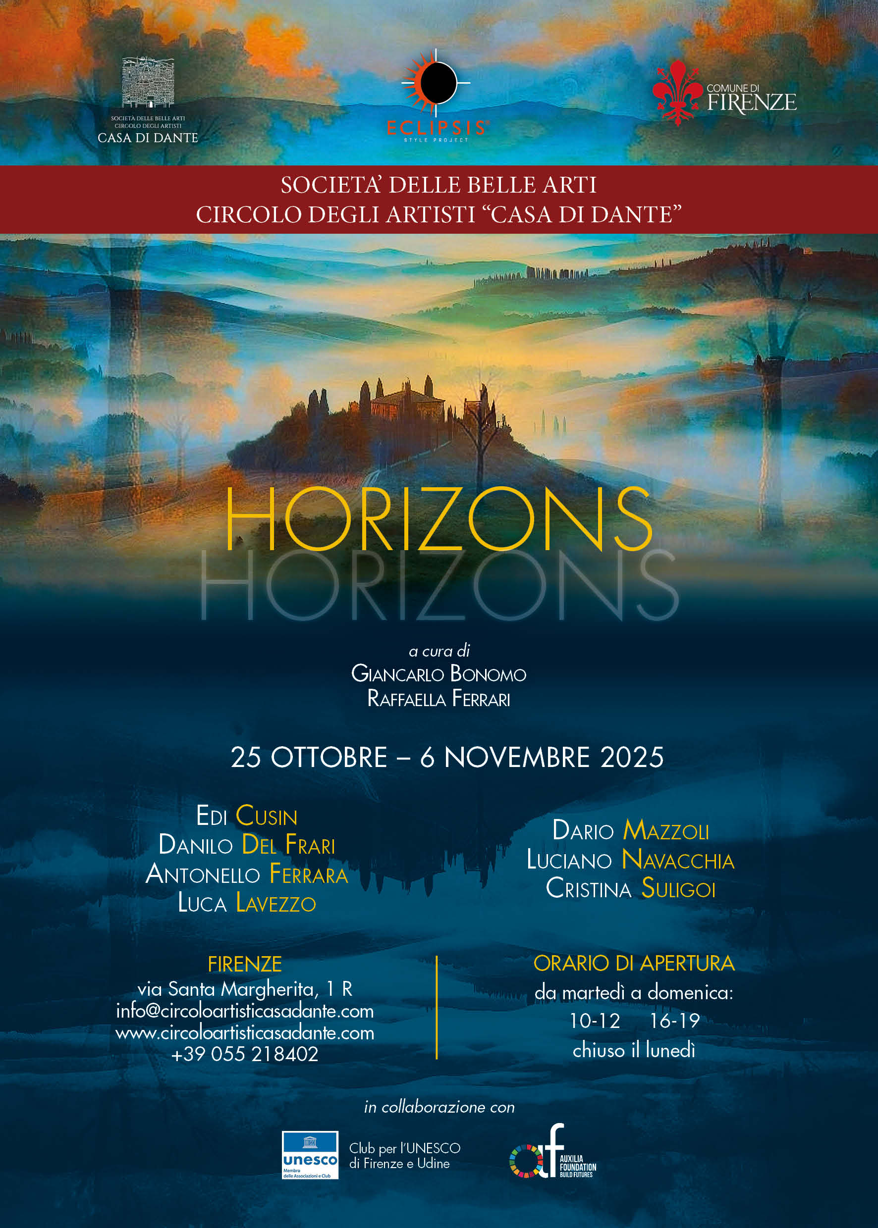 HORIZONS esplora il legame tra Uomo e Natura in una dimensione di silenzio e contemplazione. Visioni paesaggistiche e presenze totemiche evocano civiltà e sogni atemporali. 📍Casa di Dante, Firenze | 25 ott – 6 nov 2025 | A cura di Bonomo e Ferrari.