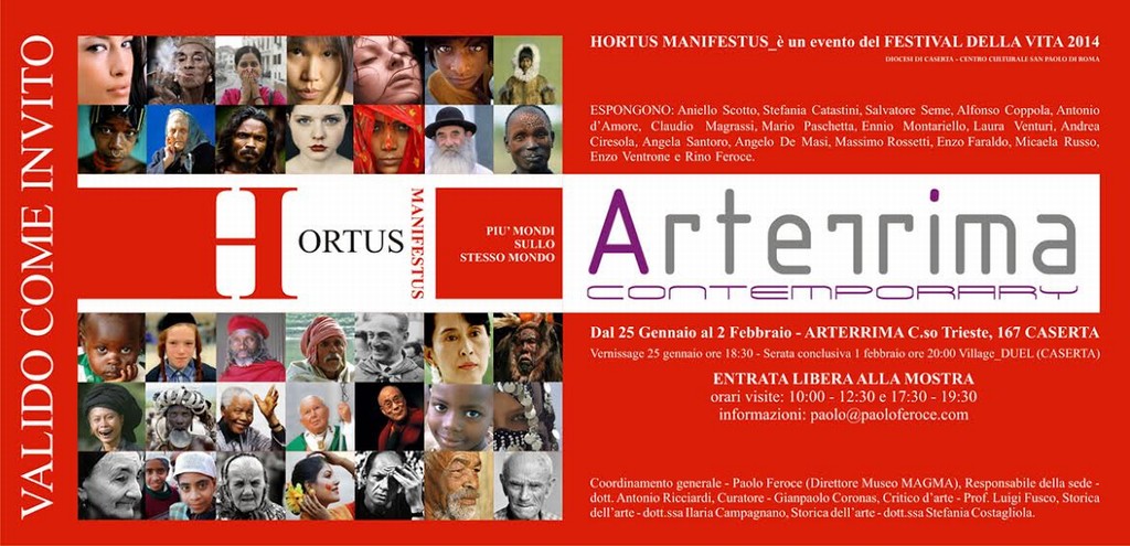 In occasione della manifestazione internazionale denominata FESTIVAL DELLA VITA, organizzata dalla Diocesi di Caserta e dalla Società San Paolo di Roma, il consulente della sezione Arti Visive dell'evento, Paolo Feroce (già direttore artistico del Museo MAGMA), per l'occasione presenterà la mostra HORTUS MANIFESTUS: Più mondi sullo stesso mondo.