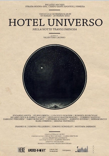 A partire da uno dei grandi interrogativi cosmologici la mostra HOTEL UNIVERSO, nella notte Transluminosa intende interrogarsi sui concetti di notturno, non conoscenza o conoscenza fragile, sogno lucido, previsione, chiaroveggenza, per delineare secondo un metodo fondato sull'”entanglement” (intreccio) un percorso espositivo volto a innescare una riflessione sullo sguardo dell'artista come sguardo rivelatore e visionario. Làddove l'occhio incorre nel suo handicap, nel cosìddetto “punto cieco” dove la retina non contiene recettori per la luce, l'opera assume il ruolo di bussola, orientando lo spettatore nei vicoli laterali alla conoscenza ordinaria.