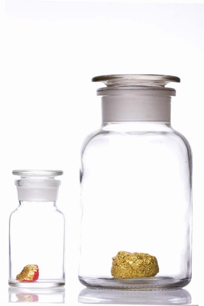 5 vasi di vetro che contengono 5 cristalli: uno rosa (le risorse terrestri solide negli “schemi”), uno blu (le risorse terrestri liquide), uno nero (lo scarto della produzione), uno di zucchero rosa parzialmente ricoperto d’oro (a rappresentare il processo di trasformazione della risorsa) e uno d’oro (a rappresentare il prodotto finale).