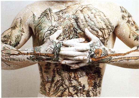 In queste immagini appare un corpo nudo maschile che l’artista ha precedentemente dipinto con una tecnica che ricorda l’attualissima body painting e con soggetti paesaggistici tipici della pittura tradizionale cinese e propri del genere Shan-Shui (letteralmente "montagna e acqua", elementi naturali fondamentali).