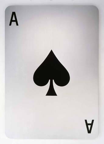 Nel primo ambiente della galleria è simulata una sala da gioco, con moquette e pareti blu, in cui sono installate quattro enormi carte francesi d’alluminio che formano un poker d’assi. Immagine fortemente connessa all’iconografica americana, dotata di un’esplicita e diffusa riconoscibilità