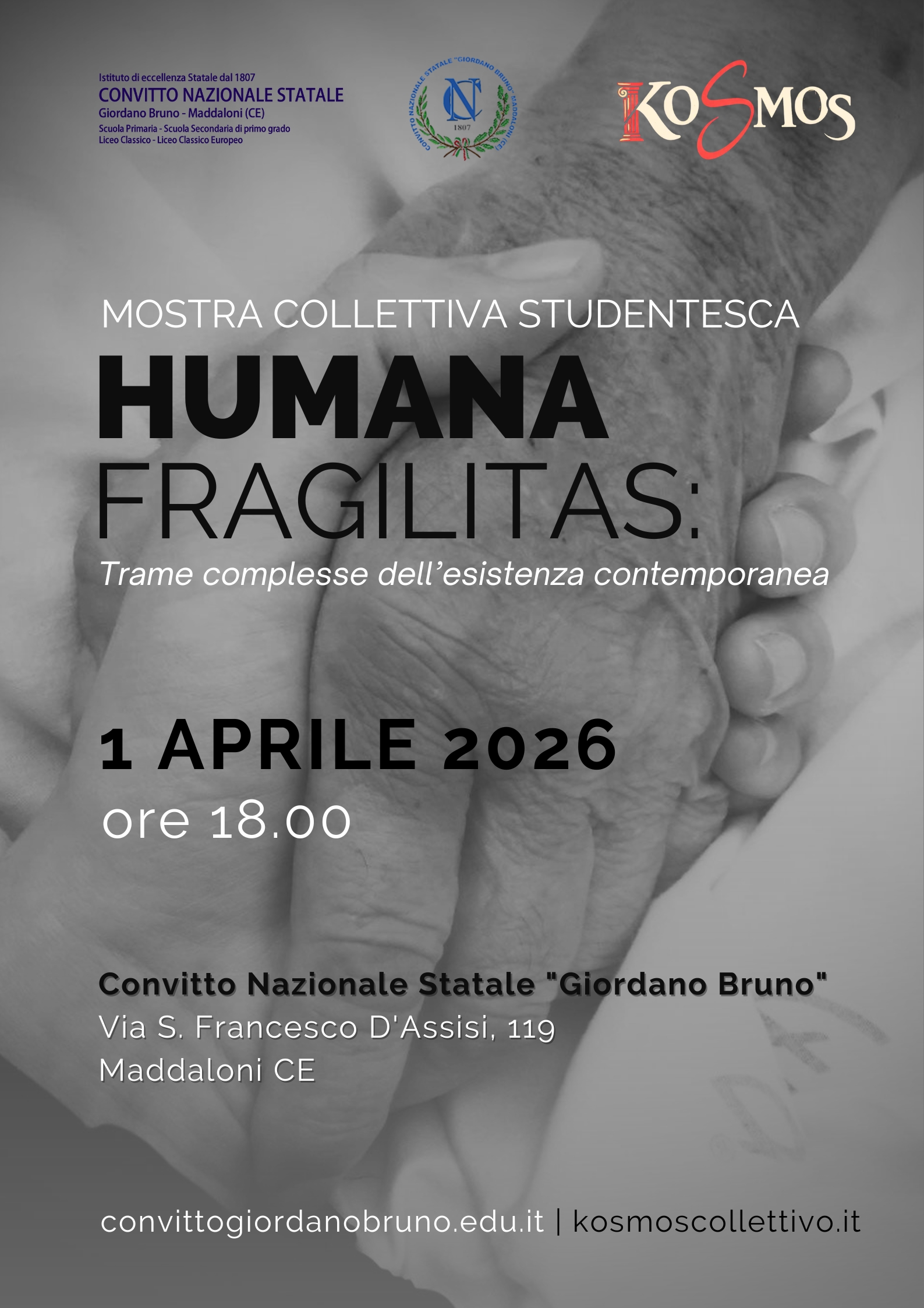 La mostra Humana Fragilitas: oltre i confini del visibile. Trame complesse dell’esistenza contemporanea si terrà il 1° aprile alle ore 18 nello storico Salone del Convitto.