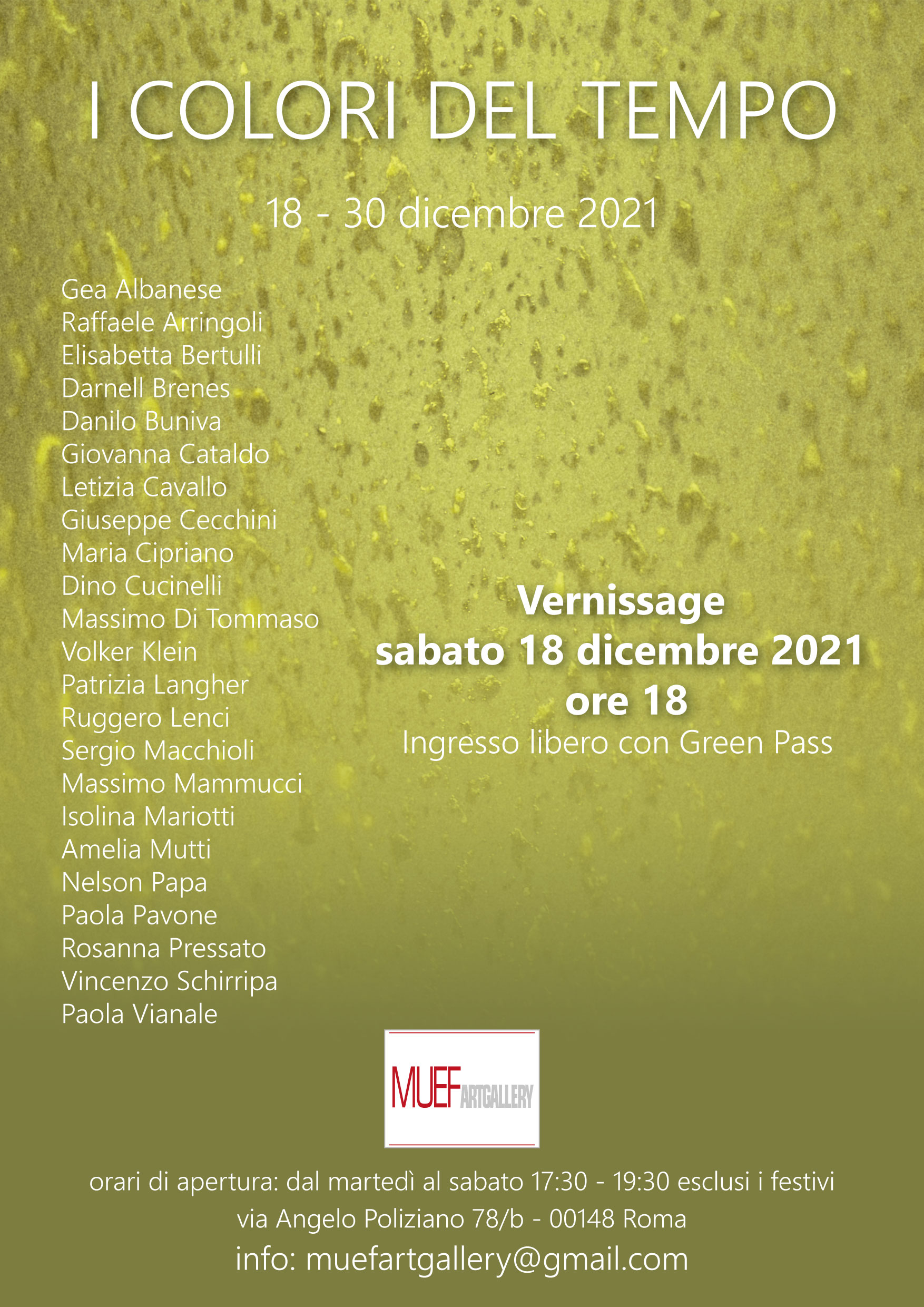 Il Muef ArtGallery con la mostra “I COLORI DEL TEMPO” propone attraverso le opere d’arte di 23 autori un’intima riflessione sul tempo, su questo concetto per tutti noi così ambiguo e sfuggente, lasciando agli artisti il compito di svelarcene i molteplici significati attraverso un immaginario vasto e plurale di cromie, toni e figurazioni.