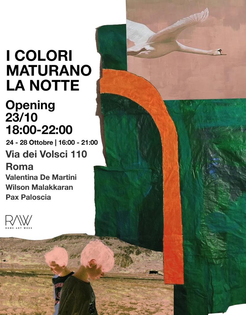 In occasione della Rome Art Week, Studio110 inaugura la sua attività con la mostra “I colori maturano la notte”, una collettiva degli artisti Valentina De Martini, Wilson Malakkaran e Pax Paloscia, che utilizzano il colore come strumento centrale di espressione e chiave di lettura del mondo.