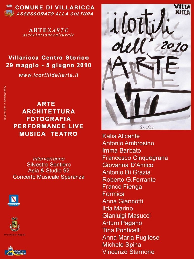 Sabato 29 maggio 2010 alle ore 18,00 presso la Sala Consiliare del Comune di Villaricca, si inaugura la VIII edizione della manifestazione “I Cortili dell’Arte”, un progetto ideato dall’Associazione Culturale ARTEXARTE di Tommaso Ferrillo e promosso dal Comune di Villaricca, Assessorato alla Cultura.