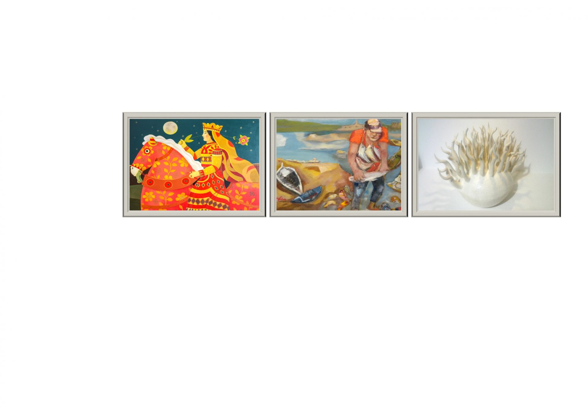 ci trascina magicamente fuori dal tempo e ci incanta con i suoi spazi silenziosi e le figure solitarie e mistiche. Le sue tele sono vere e proprie aperture verso altri mondi, che ci permettono di sbirciare all’interno del suo fantasioso immaginario.