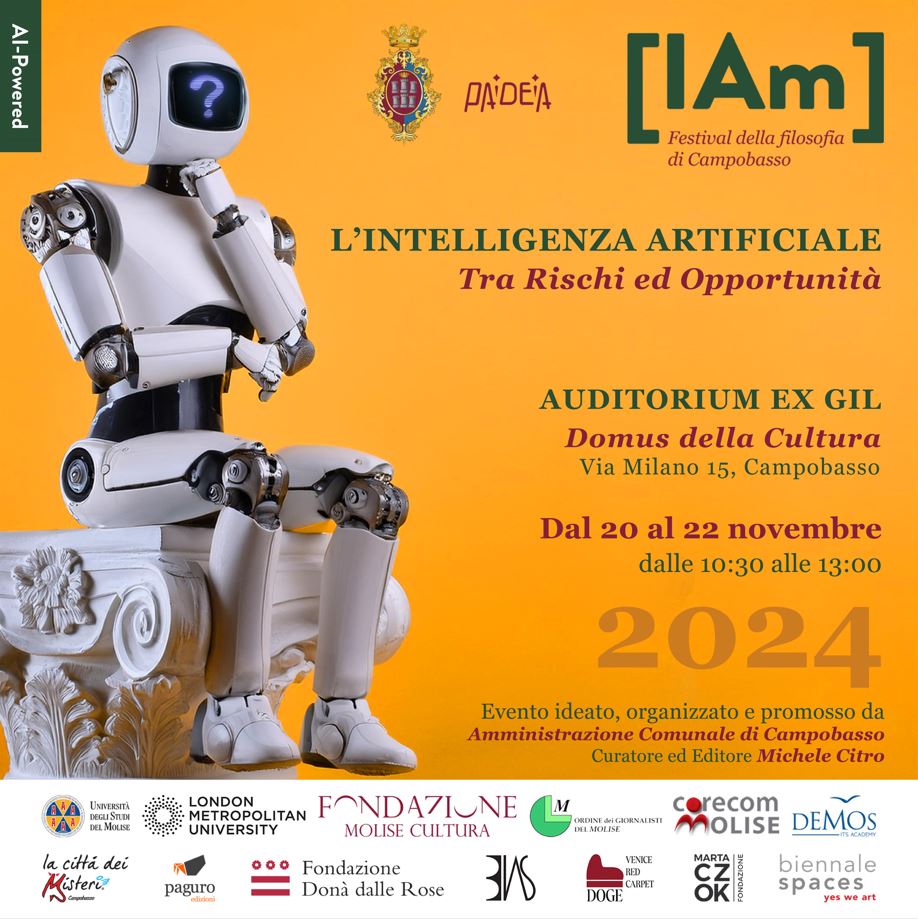 In programma 3 giorni — 20, 21 e 22 novembre 2024 — in cui l’Auditorium situato presso la sede dell’ex GIL — Domus della Cultura di Campobasso sarà l’arena di confronto tra l’I.A. e diversi campi del sapere e della vita: l’etica, la politica, il diritto, il lavoro, la comunicazione e l’arte.
