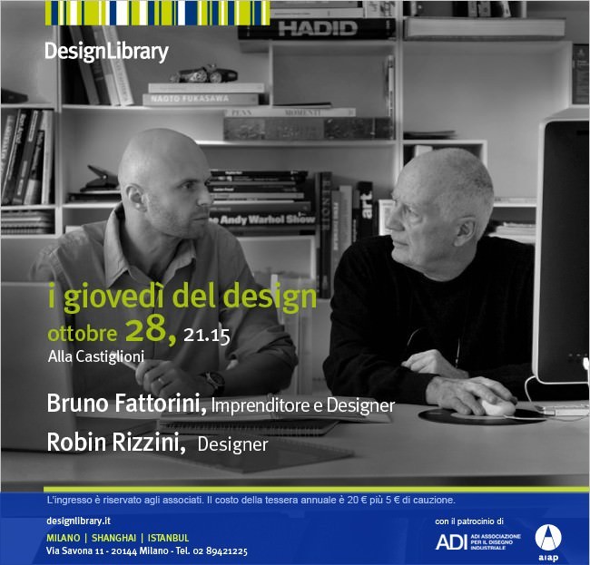 Bruno Fattorini e Robin Rizzini, fondatori dello studio Bruno Fattorini & Partners, saranno protagonisti del prossimo appuntamento del ciclo di incontri “I Giovedì del Design”, dedicati al settore, alle sue novità e ai suoi protagonisti, che si tengono ogni settimana presso la Design Library, con un intervento dal titolo “Il mestiere del designer tra ricerca e tecnologia”.