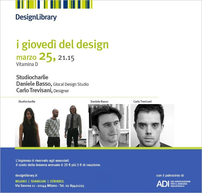 Il ciclo di incontri “Vitamina D, Porte aperte ai giovani designer” vede come protagonisti Gabriele Rigamonti, Carla Scorda e Vittorio Turla di Studiocharlie, Daniele Basso di GlocalDesign e Carlo Trevisani. I giovani talenti, architetti e designer, si racconteranno attraverso i loro progetti più importanti e parleranno in anteprima, dei prodotti che presenteranno al Salone Internazionale del Mobile 2010.