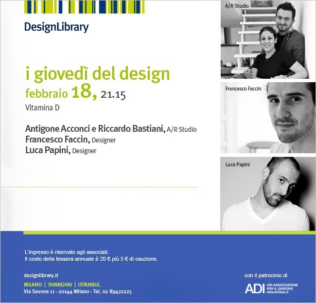 Il ciclo di incontri “Vitamina D, Porte aperte ai giovani designer” vede come protagonisti Antigone Acconci e Riccardo Bastiani di A/R Studio e i designer Francesco Faccin e Luca Papini. I giovani talenti, architetti e designer, si racconteranno attraverso i loro progetti più importanti.