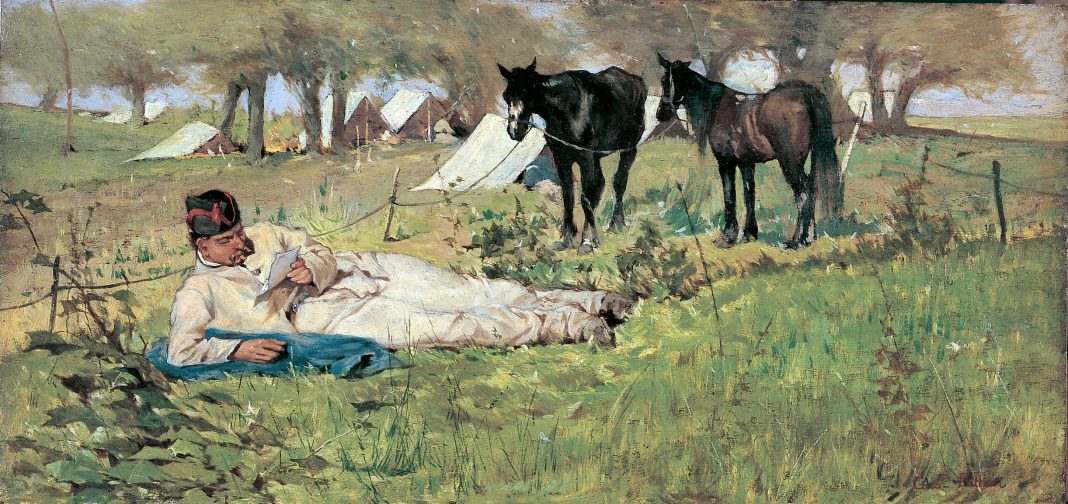 Immagine: Giovanni Fattori, La lettera al campo, 1873-1875, Olio su tavola, 16,6 x 34,5 cm, Milano, Museo Nazionale della Scienza e della Tecnologia Leonardo da Vinci