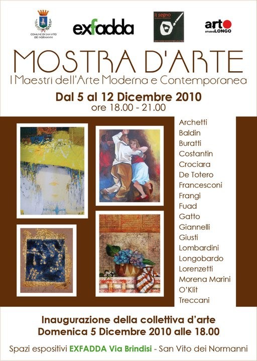 I locali del laboratorio urbano denominato ExFadda, accoglieranno le opere di alcuni tra i più importanti maestri dell’arte contemporanea italiana: Archetti, Baldin, Buratti, Costantin, Crociara, De Totaro, Francesconi, Frangi, Fuad, Gatto, Giannelli, Giusti, Lombardini, Longobardo, Lorenzetti, Morena Marini, O’Klit, Treccani. Ogni autore sarà rappresentato da almeno tre opere, che renderanno chiara la loro origine da culture contrapposte.