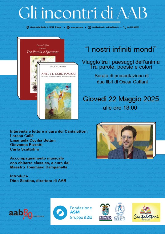 giovedì 22 maggio alle ore 18.00, si terrà l'incontro dal titolo: “I nostri infiniti mondi - Viaggio tra i paesaggi dell’anima. Tra parole, poesie e colori". Incontro del tutto particolare poiché prevede la presentazione di due libri dell’autore Oscar Coffani: il primo una raccolta di poesie dal titolo “Tra poesia e Speranza” ed il secondo un racconto intitolato: “Ariel e il cubo magico”. Durante la serata ci sarà un momento musicale con chitarra classica, a cura del Maestro Tommaso Campanella.