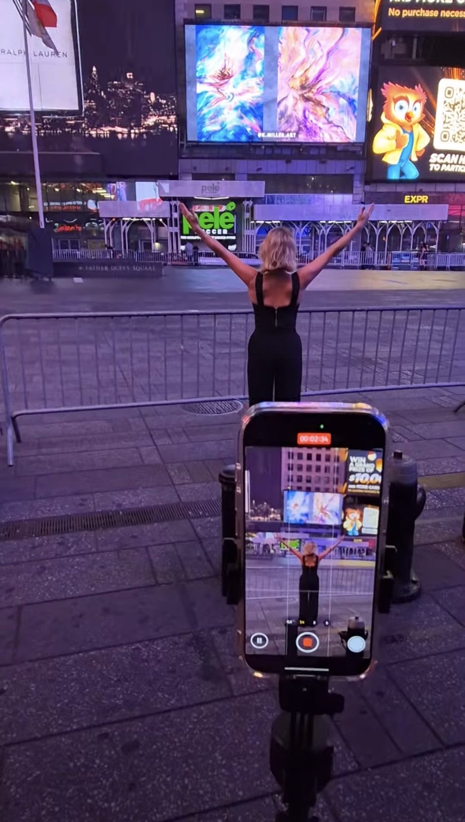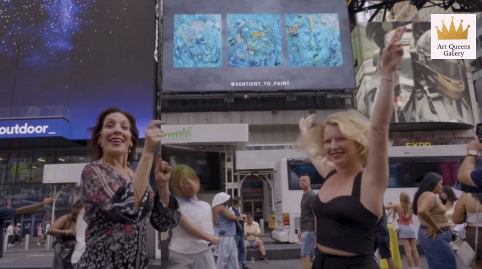 New York, NY — In the heart of Times Square, where neon lights never dim and movement never stops, artist Simona Ray staged an unforgettable performance that captured both art lovers and unsuspecting passers-by. For 24 hours, every hour on the hour, she returned to the same spot — standing motionless in front of a giant screen projecting her paintings. Behind her, her art was magnified for thousands to see; before it, she stood quietly, as the living artist, small yet powerfully present.