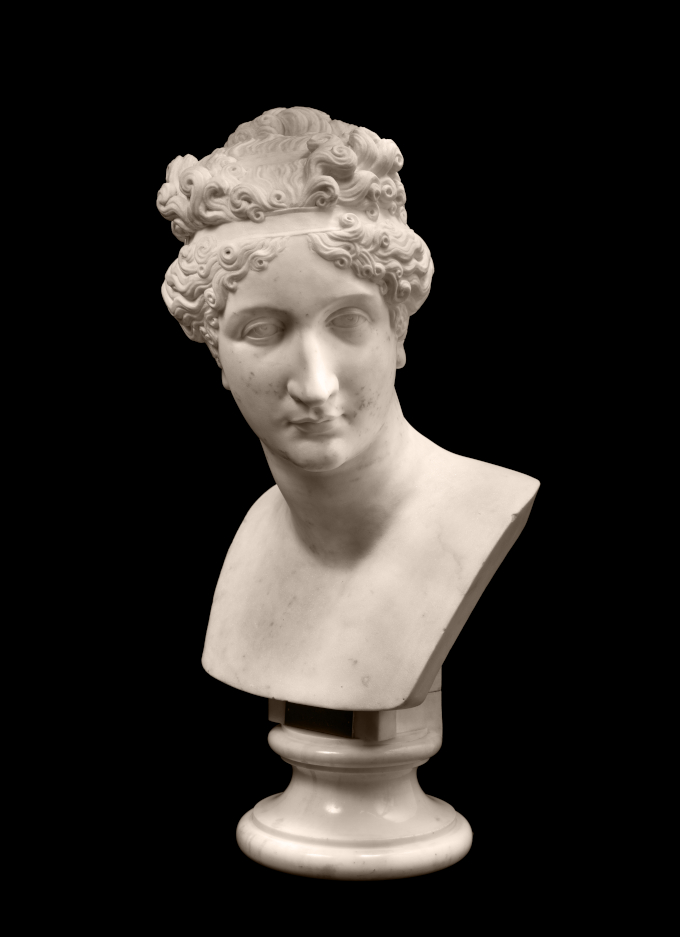 In seguito allo scalpore suscitato tra il 1730 e il 1740 dall’inatteso ritrovamento dei resti di Ercolano e Pompei, i teorici dell’arte neoclassica recuperano il concetto della kalokagathìa tornando nuovamente ad associare i principi di ordine, armonia, compostezza e “quieta grandezza”, come afferma Winckelmann, con i più elevati valori morali. Leopardi stesso riconosce in Antonio Canova l’artista che meglio incarna nelle proprie opere questo connubio di bellezza e nobili sentimenti che mira a raggiungere il bello ideale. Il Ritratto di Paolina Bonaparte, che arriva in mostra dal Museo Napoleonico di Roma, raffigura il viso perfetto della sorella di Napoleone come Venere Vincitrice, esempio di come la celebrazione del passato e l’uso dei temi della mitologia classica si pongano, in questo caso, al servizio del potere, assumendo intenti celebrativi e educativi.