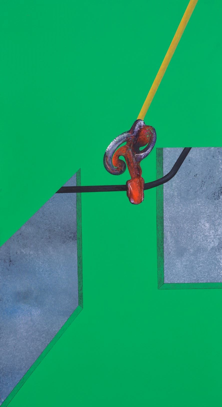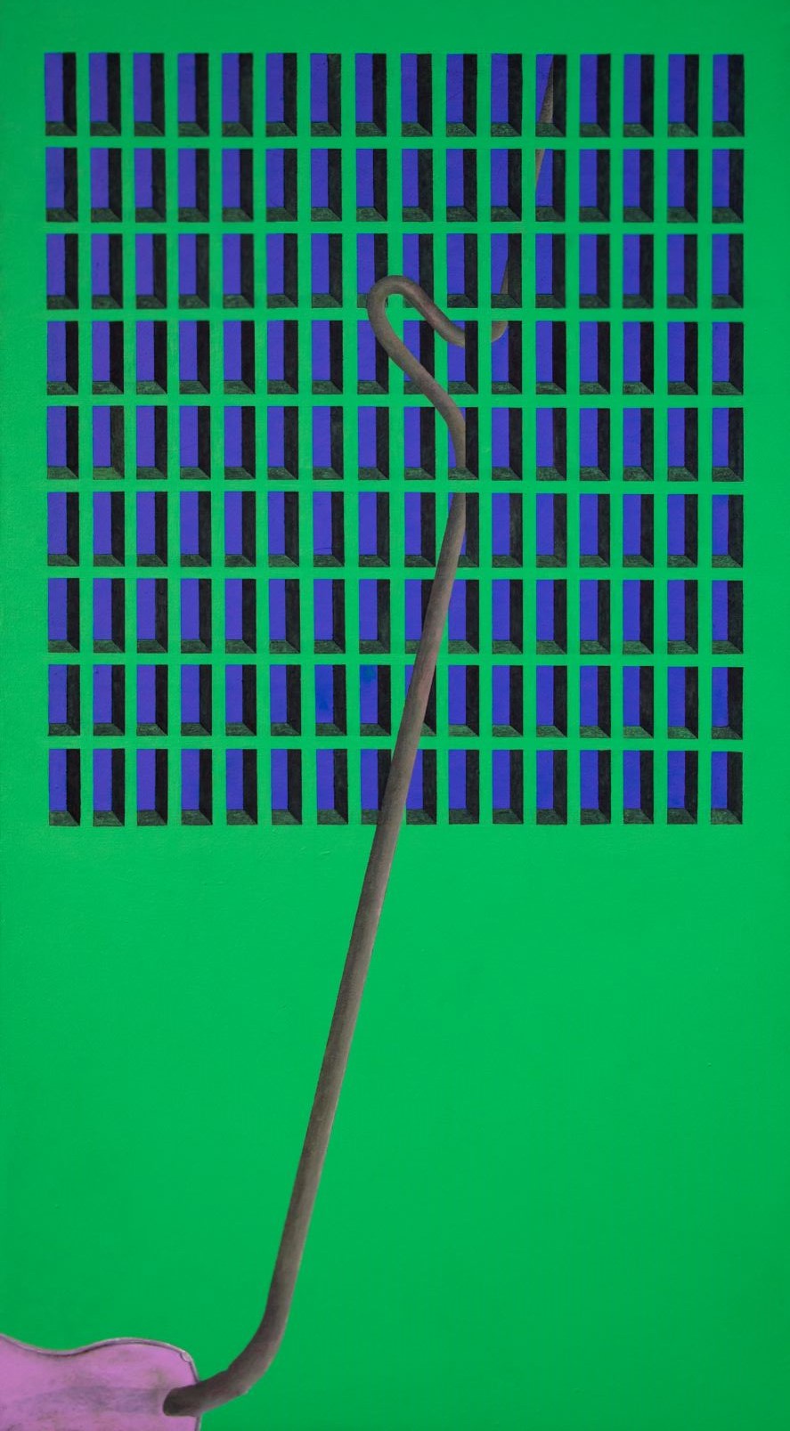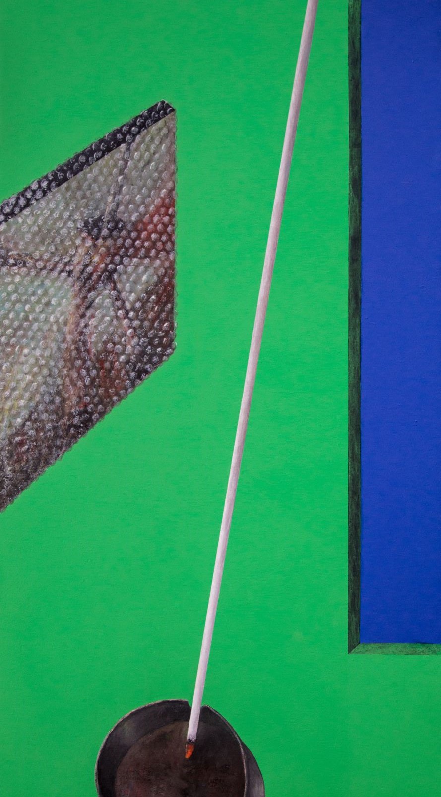 Se nella serie di tavole Iperuranio, sviluppata tra il 2016 e il 2018, era forse più evidente la convivenza nella stessa opera di diverse possibilità del dipingere, nella nuova serie di tele, intitolata Enigma, oggetti sconosciuti o trasfigurati affiorano in uno spazio cieco, luogo della mente dominato da un verde luminoso e assoluto che ci riporta all’assenza di appigli di un green screen. I soggetti sono rappresentati come instabili materializzazioni del pensiero che appaiono nel vuoto, immagini mentali che prendono corpo grazie ad un’energia che ne stabilizza temporaneamente la forma. La rappresentazione pittorica è percorsa da tubolari che sembrano poter convogliare l’energia vitale dell’immaginazione in percorsi dalle diramazioni imprevedibili. Proseguendo fino ai margini della superficie pittorica o dissolvendosi nel buio di varchi aperti su altre dimensioni, le condutture uniscono la scena raffigurata a ciò che potrebbe affiorare oltre la soglia, mettendo in comunicazione il visibile con l’ignoto.