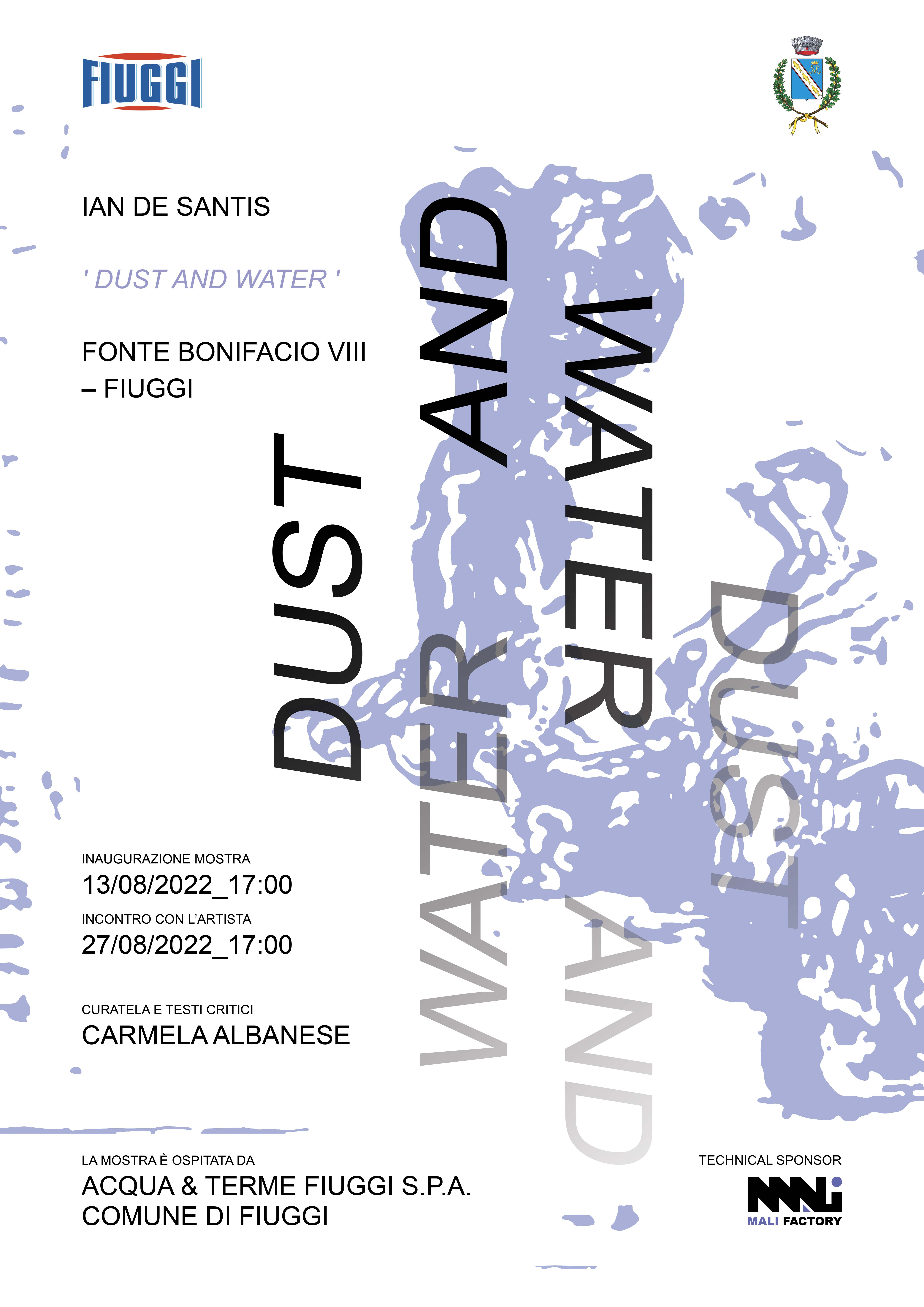 ‘Dust and Water’ (polvere ed acqua), personale di Ian De Santis. Curatela e testi critici di Carmela Albanese. La mostra è allestita nei locali della Fonte Bonifacio VIII di Fiuggi, nella splendida cornice del complesso termale di Luigi Moretti. Evento promosso da Acqua e Terme di Fiuggi SpA.