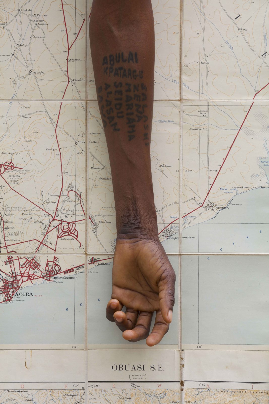 Maps of the Gold Coast (1898-2019) consiste in un gruppo di mappe del 1920-1950 oggi obsolete, prodotte durante il periodo coloniale in Ghana. Le mappe presentano tracce delle ricerche eseguite dagli inglesi durante la costruzione della ferrovia (ora quasi interamente in disuso) realizzata per il trasporto di merci e minerali, sulle quali Mahama è intervenuto con dei disegni. Queste mappe sono affiancate da una serie di fotografie che ritraggono l’avanbraccio di alcune donne provenienti da paesini del nord Ghana, vicini a dove Mahama è cresciuto. Partite per trovare lavoro come operaie nella capitale Accra, le donne si tatuano le braccia con i loro nomi e i contatti dei loro cari, nel caso venissero uccise o ferite durante uno dei numerosi incidenti stradali o in cantiere. Mahama è convinto che questa particolare crisi rappresenti un’apertura verso nuove conversazioni sull’idea del corpo nel ventunesimo secolo.