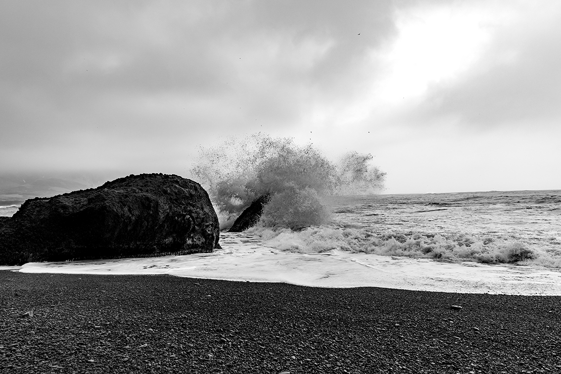 Il suo incontro con questa terra è quindi racchiuso in queste immagini dove la forza di una natura che non fa sconti - né a chi ci vive, né a chi prova a fotografarla – si percepisce in modo evidente. Si coglie nei colori morbidi della terra e del cielo, nel contrasto del bianco e nero di acqua e roccia vulcanica, nella luce e nel senso di quiete.