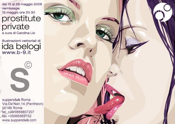 Il 15 Maggio inaugura al Supper Club di Roma "Prostitute private", mostra personale di Ida Belogi. In mostra saranno presenti dieci opere scelte tra la sue ultime creazioni. Si tratta di disegni vettoriali, creati quindi in digitale, che raffigurano giovani donne erotiche, sensuali, piccanti, sfiziose, divertenti, ironiche e intelligenti. Ognuna, creata dall'artista prima di tutto per il proprio piacere personale, identifica un lato di Ida Belogi, creatrice e amante di tutte le protagoniste. La mostra, a cura di Carolina Lio, sarà allestita e resterà visitabile fino al 28 Maggio negli orari di apertura del locale.