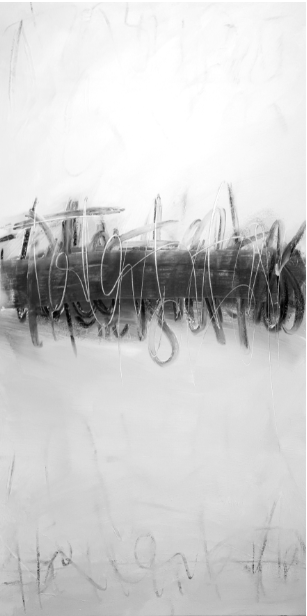 I segni neri in alcune parti della tela appaiono più fermi e nitidi, mentre in altri il colore bianco tende a opacizzarli, come fossero sul punto di svanire, per poterne accogliere degli altri. I tratti tuttavia restano visibili, come delle correzioni di percorso che “segnano” la nostra identità e ci permettono di ricordarli, come degli errori da cui possiamo imparare, senza azzerarli.