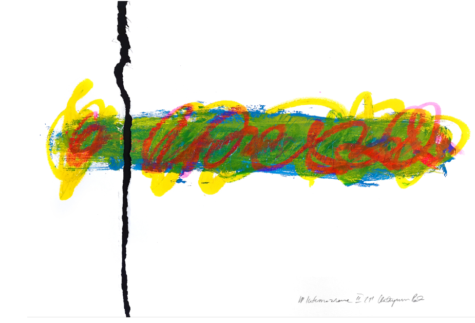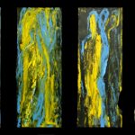 Analogamente le opere in cui sono riconoscibili delle sagome di figure umane, realizzate su carta con tecnica mista, alludono a un mutamento interiore che progressivamente prende forma all’esterno, e si manifesta tramite tre colori, giallo, blu e nero, da cui deriva una forma ancora non definita. I colori che accomunano le sagome evocano quello che secondo i greci è il Daimon individuale, la nostra anima pura, la vocazione che ciascuno di noi porta con sé sin dalla nascita e che nel corso della vita, durante la nostra definizione, a seconda della fedeltà che stiamo dimostrando nei confronti del nostro disegno personale, si manifesta ai nostri occhi sotto forma di casualità, imprevisti, colpi di fortuna o cambi di rotta.