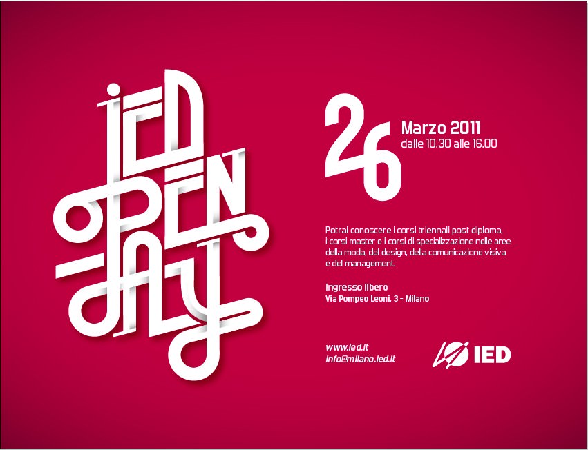 Il 26 marzo 2011, IED Milano invita studenti, diplomandi delle Scuole superiori e laureati, professionisti e giovani creativi appassionati di design, moda e comunicazione visiva per l’Open Day, una giornata di orientamento per entrare a contatto e conoscere da vicino le Scuole e i Corsi della sede milanese dell’istituto Europeo di Design. Il primo appuntamento dell’anno organizzato per aiutare e guidare i giovani studenti in una scelta consapevole e mirata del proprio percorso di studio e formazione.