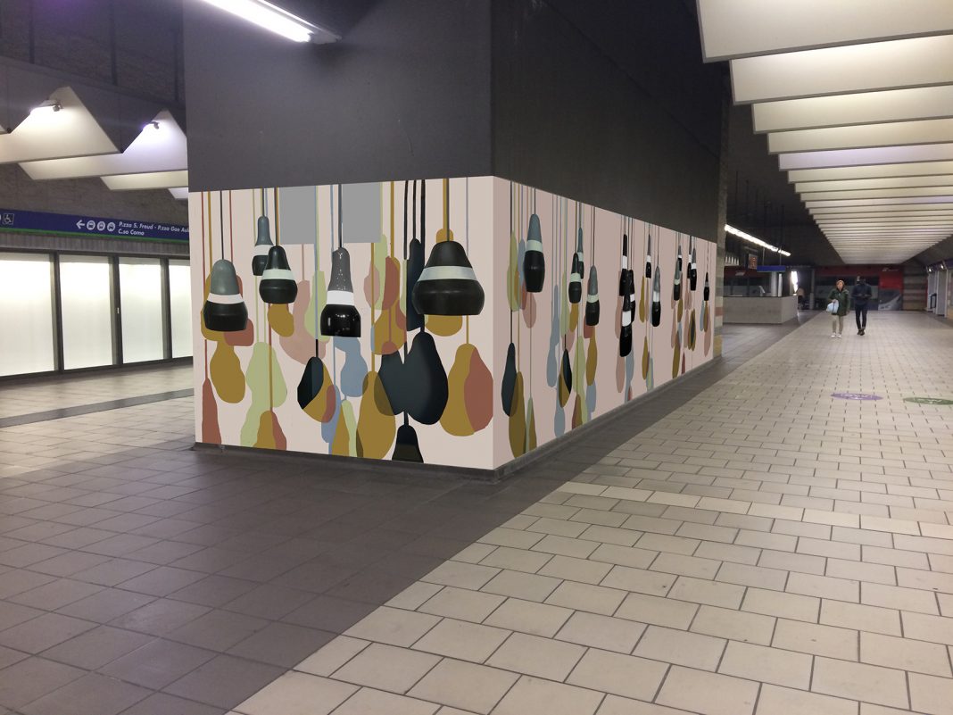 L’auspicio di Ieva Pētersone è di portare arte, un po’ di luce e giocosità nella fretta quotidiana attraverso il suo dipinto murale negli spazi sotterranei della stazione Garibaldi. Le lampade che ritrae, in versione bianco e nera, lasciano spazio al gioco delle ombre.