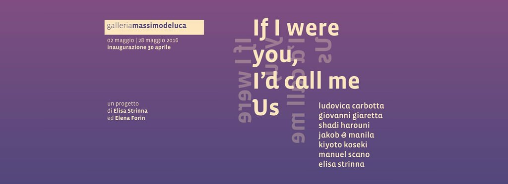 If I were you, I’d call me Us è un progetto a lungo termine che nasce da una suggestione dell’artista Elisa Strinna sviluppata con la curatrice Elena Forin. Questa prima tappa del progetto vede protagonisti alla Galleria Massimodeluca sette artisti internazionali, tra cui la stessa Strinna. Il titolo della mostra, ripreso da una poesia del poeta americano Ogden Nash , allude alla possibilità di definire le identità in forma collettiva andando oltre ogni idea d’indivisibilità e aprendo a diversità, discussione, trasversalità, scambio o conflitto