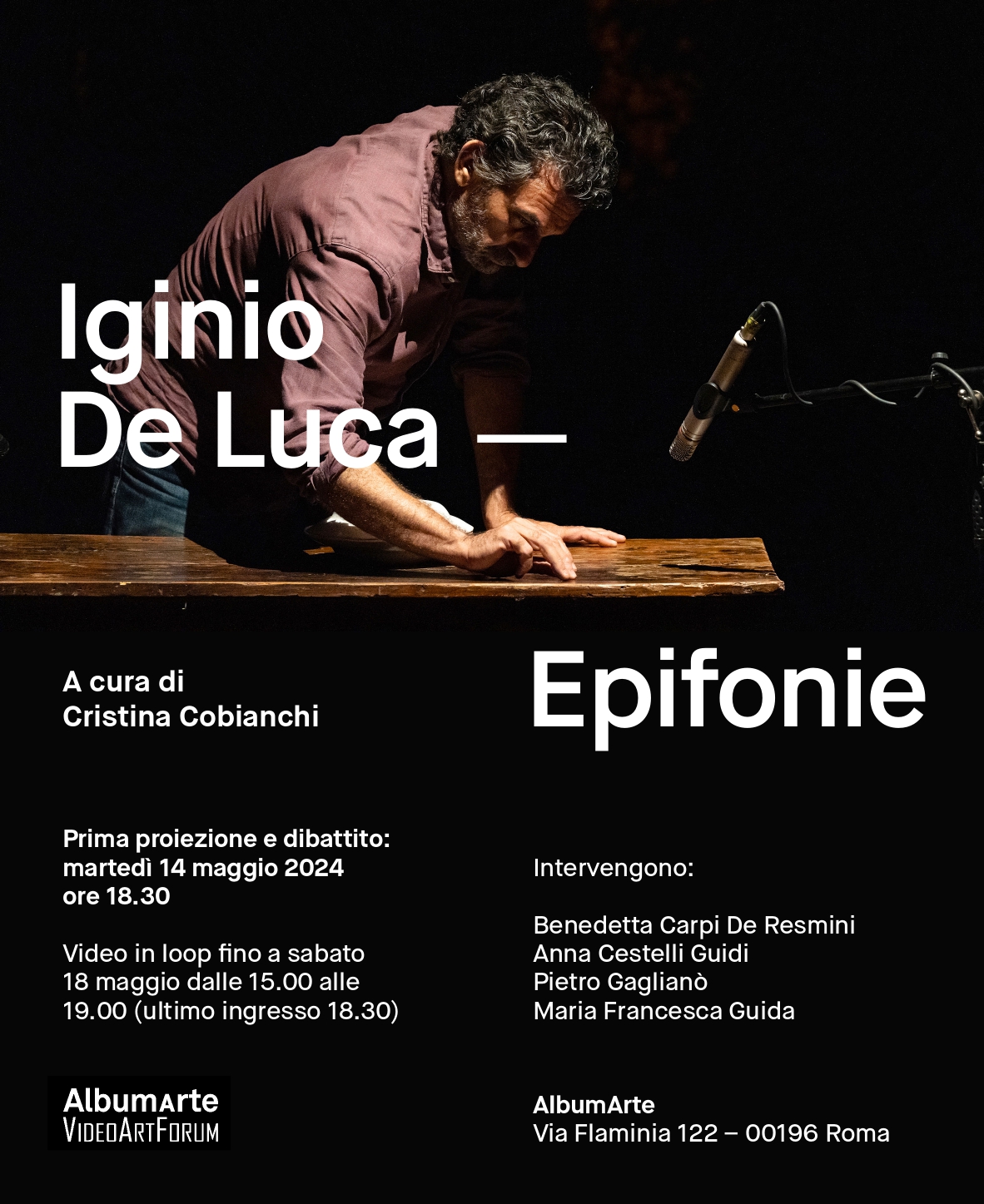 AlbumArte presenta IGINIO DE LUCA, EPIFONIE. A cura di Cristina Cobianchi un insieme di otto video dove l’artista usa il suono come protagonista o co – protagonista della sua opera. Seguirà un dibattito con quattro critici e curatori che nel tempo hanno lavorato con lui.
