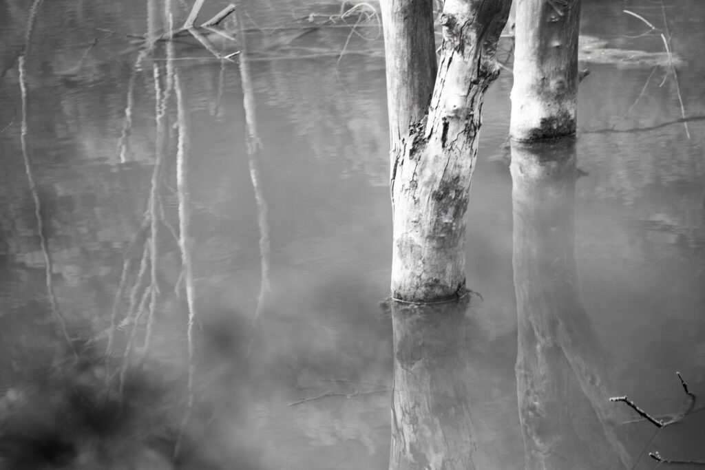 L’artista spagnolo ha scoperto nel 2019 il lago in località Poggio Baldi di Corniolo (Comune di Santa Sofia), bacino generato da una grande frana del monte soprastante. Quel luogo gli è apparso come una perfetta descrizione di quella condizione di precarietà umana oggetto del suo interesse. Il lago è diventato una sorta di metafora: il buio del disastro ambientale capace di generare nuova vita. Ignacio Llamas ha fotografato il lago in tutte le condizioni di luce, all’alba, al tramonto, e nelle ore centrali del giorno, quasi come se al cambiare della luce si potessero rivelare cose nuove. Biologicamente la morte progressiva del bosco di douglasie annegate nel lago ha offerto nuove possibilità di vita a nuove specie di uccelli limivori e acquatici e altre specie vegetali, come pioppi e ontani, hanno infoltito la costa. Un messaggio fortemente metaforico che l’artista ha colto immediatamente perché corrisponde esattamente al suo sentire.