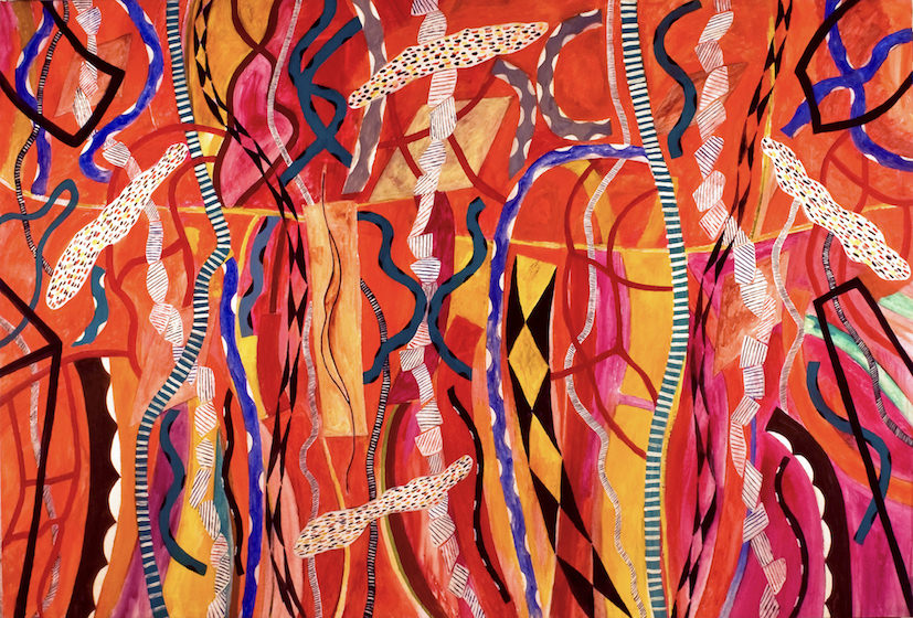 Nel raccontare la mostra, Francesco Tedeschi, già curatore della retrospettiva dell’artista tenutasi alle Fabbriche di Chiaramontane di Agrigento nel 2014, sottolinea il carattere teatrale di un’ispirazione che si esprime nella messa in scena di una produzione unitaria in cui compaiono forme e figure provenienti da un immaginario mitico e inventato: “Si tratta di segni che ricorrono in questo insieme di lavori, tra i più omogenei della sua produzione e che meriterebbero di essere inseguiti, catturati, se possibile interpretati. Figure di matrice organica, come delle serpentine vivacemente contrappuntate da un’epidermide decorativa o delle lingue-sacche contenenti tracce di colore diviso in una miriade di punti-luce, altre di appartenenza più costruttiva e geometrica (o geometrizzante), con il richiamo a strutture architettoniche essenziali e fuori asse. Da una tela all’altra, gli stessi elementi riaffiorano, scorrendo dall’alto verso il basso (e viceversa) su un piano bidimensionale creato dagli intensi campi cromatici che annullano ogni scansione spaziale di profondità, compaiono con nuove posizioni, con un nuovo ruolo, attori di una scena ogni volta rinnovata.”