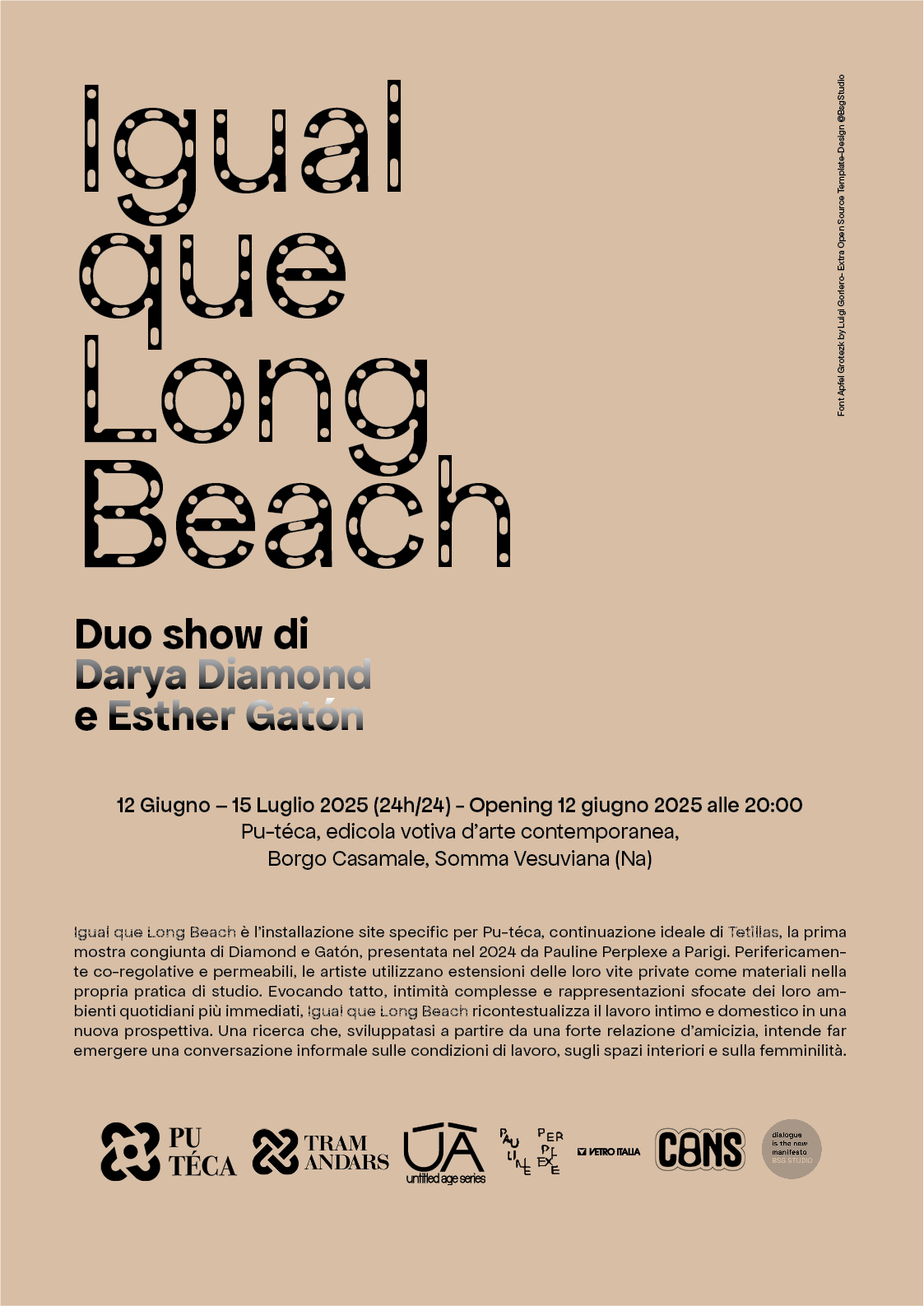 Igual que Long Beach è l’installazione site specific per Pu-teca, continuazione ideale di Tetillas, la loro prima mostra congiunta, presentata un anno fa presso Pauline Perplexe a Parigi. La mostra parigina giocava sul duplice significato del termine “tetillas”, riferendosi sia a mammelle di piccole dimensioni sia a un formaggio rurale spagnolo, per innescare il discorso su domesticità, marginalità e riconfigurazione del lavoro precario.