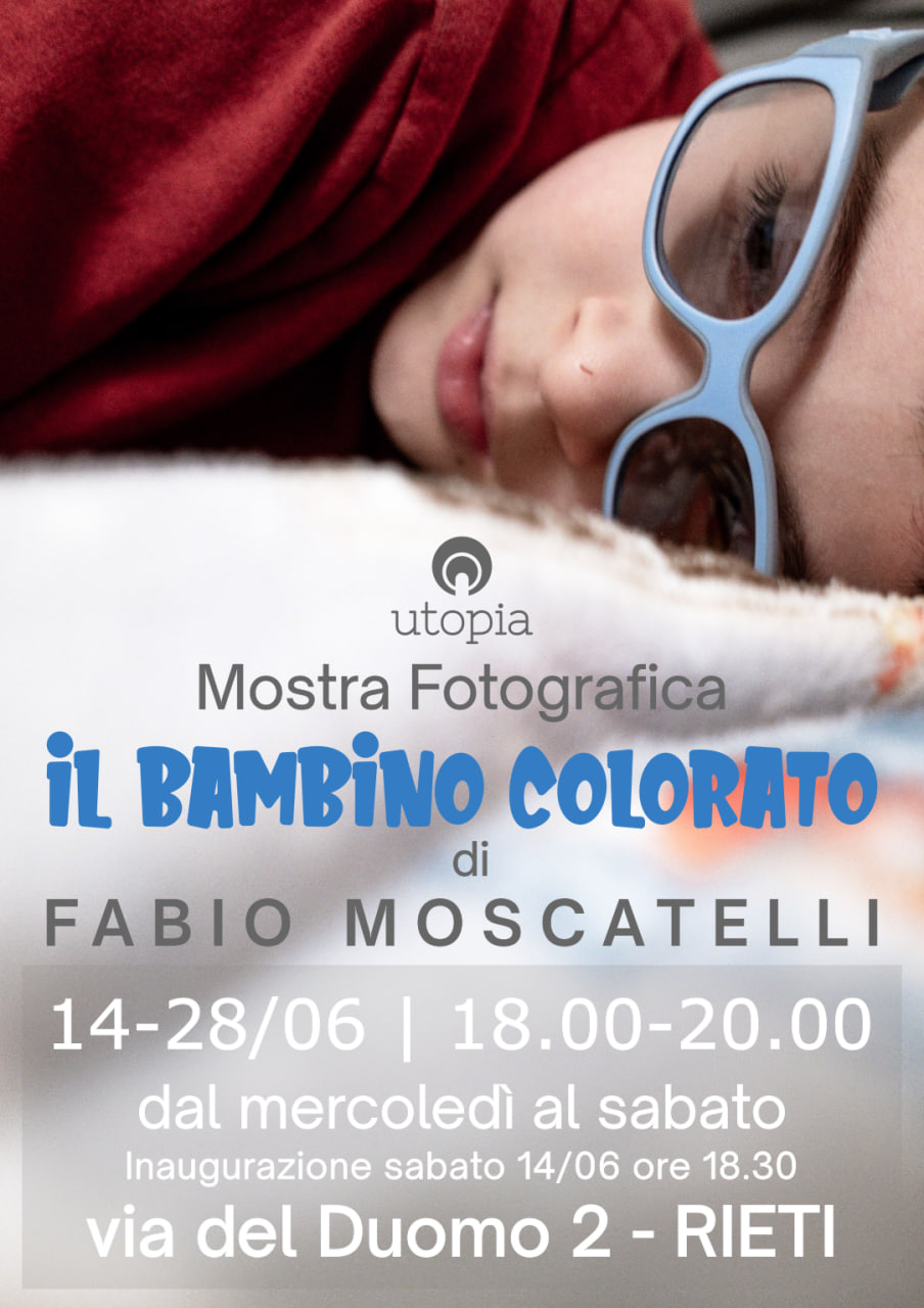 Sono passati due anni da quando l'associazione fotografica Utopia ha iniziato la propria attività a Rieti, due anni in cui la nostra cittadina ha potuto essere teatro di mostre, eventi e formazione fotografica di grande livello, diventando un polo di attrazione per gli appassionati di fotografia e non solo che spesso convergono nella sede di via del Duomo 2 anche da fuori regione, attratti dalla qualità delle proposte ospitate. Per festeggiare degnamente i due anni di presenza sul territorio Utopia proporrà, a partire da sabato 14 giugno, la mostra "Il Bambino Colorato", del fotografo Fabio Moscatelli, dedicata al racconto di Samuel, un bambino affetto da acromatopsia. L’acromatopsia è un raro difetto della vista, presente fin dalla nascita e non degenerativo, che si manifesta con cecità completa o parziale ai colori a cui si associa ipovedenza, nistagmo (movimento involontario degli occhi) e fotofobia. Samuel è un bambino che Fabio ha seguito fotograficamente dall'età di 5 anni ed è uno dei rari casi presenti in Italia (si stima ne venga colpita una persona ogni 33000). Nonostante al momento non esistano cure o operazioni il mondo di Samuel è un mondo pieno di colori e allegria. La mostra, proposta in un allestimento inedito ed immersivo presso la sede di Utopia, sarà inaugurata sabato 14 giugno alle 18.30 alla presenza dell'autore e sarà visitabile dal mercoledì al sabato, dalle 18 alle 20, fino al 28 giugno, ingresso libero. Le copie delle foto in mostra, firmate da Fabio Moscatelli, potranno essere acquistate e il ricavato sarà interamente devoluto a Samuel per l'acquisto di un dispositivo che migliorerà la sua indipendenza e autonomia, maggiori informazioni in proposito potranno essere chieste direttamente da Utopia.