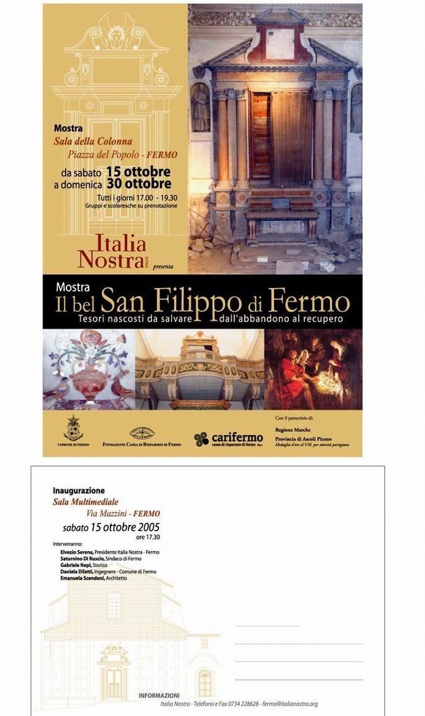 Nella mostra, che sarà preceduta da una conferenza di apertura con interventi di Elvezio Serena, Saturnino Di Ruscio, Gabriele Nepi, Daniela Diletti, Emanuela Scendoni, verrà presentata una serie di tavole tratte dalla tesi di laurea “La chiesa di San Filippo Neri a Fermo: progetto di conservazione”, discussa nel 2002 da Emanuela Scendoni presso la Facoltà di Architettura di Venezia, relatore il prof. arch. Eugenio Vassallo. Nell’interessantissimo lavoro, che lancia ipotesi di riuso, partendo dalla ricerca storico-archivistica, dagli interventi pregressi, da rilievi fotografici e geometrici, viene fatta una approfondita analisi dei materiali e del loro degrado per arrivare alla definizione degli interventi di conservazione sulle strutture e sui materiali stessi.