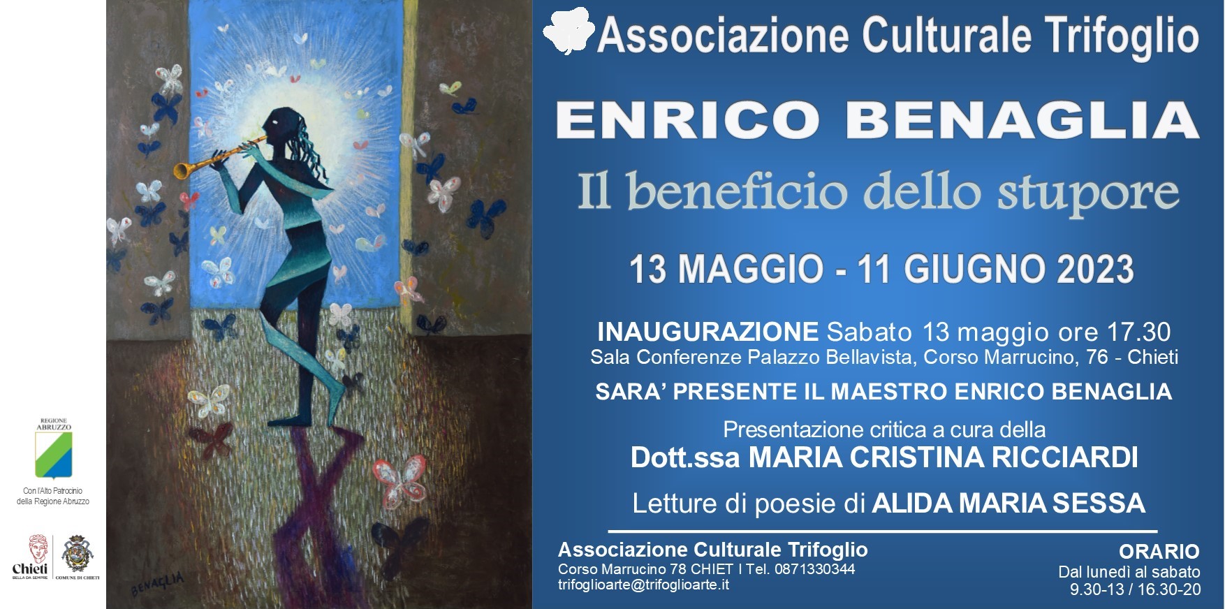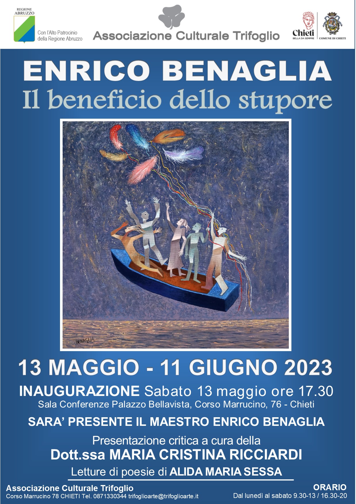 Sabato 13 maggio alle ore 17.30 l’Associazione Culturale Trifoglio con l’Alto Patrocinio della Regione Abruzzo e del Comune di Chieti inaugura la mostra personale dell’artista Enrico Benaglia dal titolo “Il beneficio dello stupore”.
