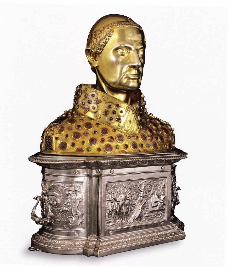 Il Busto reliquiario di San Gennaro, contenente il cranio del Santo, è considerato uno dei capolavori della scultura e dell’oreficeria gotica d’inizio Trecento. Commissionato da Carlo II d’Angiò tra il 1304 e il 1305 a quattro maestri orafi francesi per celebrare il millenario del martirio e della morte di San Gennaro, questo prezioso oggetto è realizzato in argento prevalentemente sbalzato, cesellato e dorato, e presenta più pezzi tra loro assemblati: la testa, le spalle, il colletto. Il busto, che raffigura il Santo in abiti vescovili, è finemente decorato con pietre preziose e mostra ben 63 bottoni circolari in smalto blu o rosso con gigli d’oro.