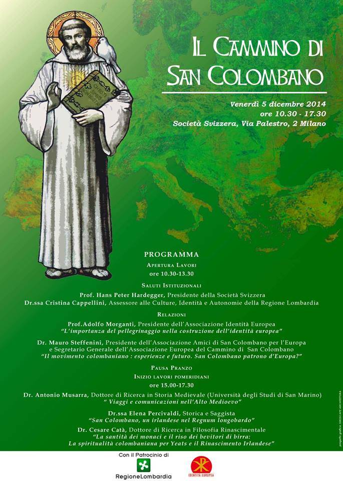 Venerdì 5 Dicembre 2014 presso la sede della Società Svizzera di Milano in Via Palestro 2 si svolgerà il Convegno dedicato all’importantissima figura del Santo Irlandese, San Colombano che dall’Irlanda pellegrinò per le vie d’Europa passando per Francia, Austria, Svizzera, Lombardia ed Emilia dove morì. Lungo questo percorso fondò moltissimi monasteri e lasciò ai popoli europei un’eredità del cristianesimo irlandese ancora presente oggi con tradizioni secolari.