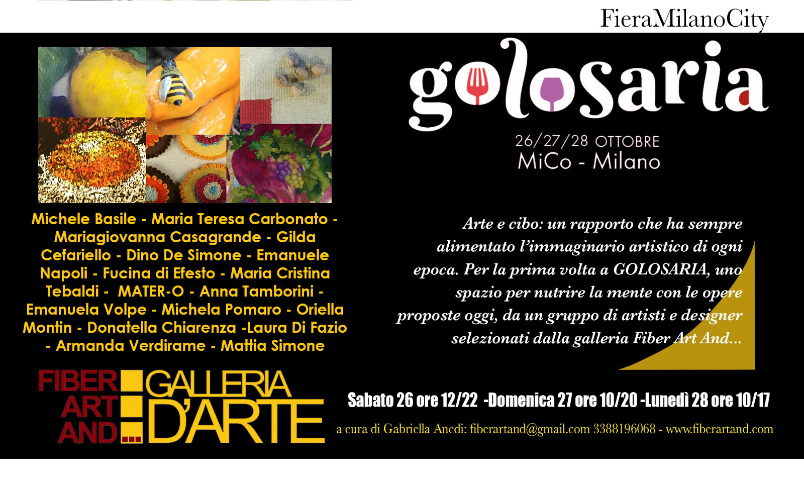 L’arte entra da protagonista a Golosaria, la rassegna enogastronomica ospitata al Mi.co. Milano Congressi dal 26 al 28 ottobre. La Galleria Fiber Art and…. di Milano ha selezionato alcuni artisti che esplorano i possibili immaginari dell’alimentazione: