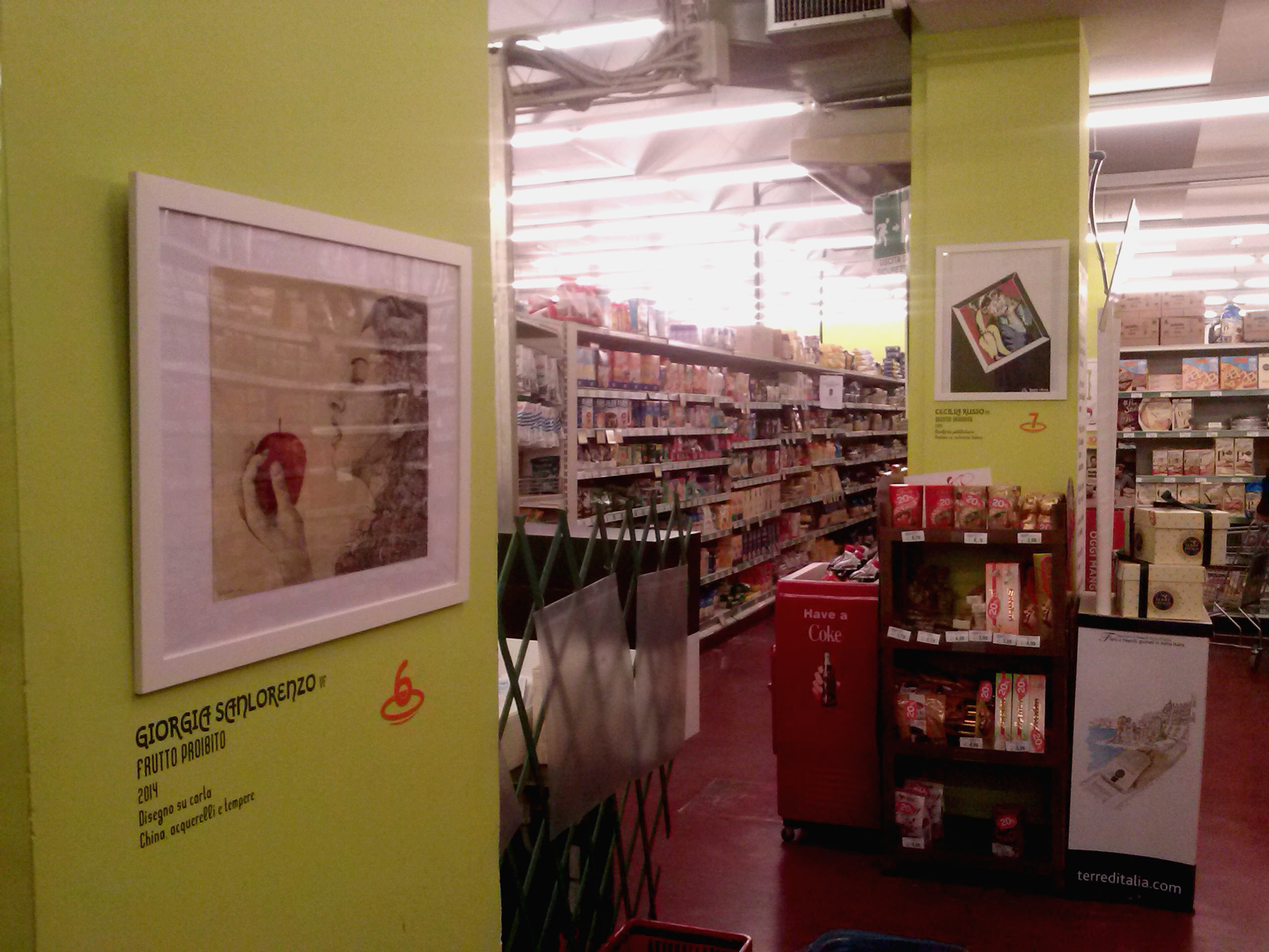 Le opere dei giovani studenti del liceo artistico di Asti esposte in un supermercato, in mezzo alle corsie.